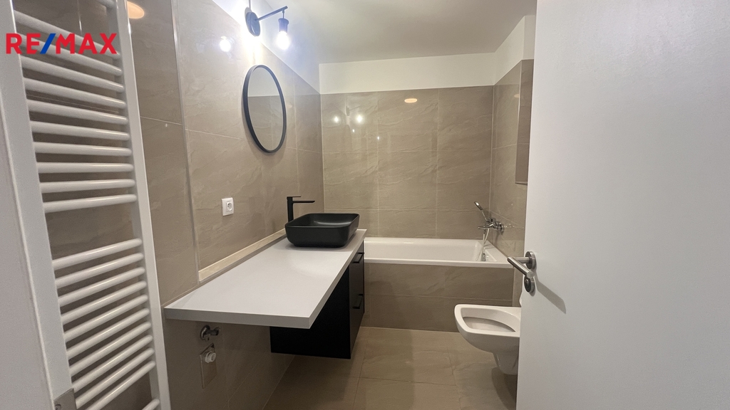 Koupelna společná s toaletou je vybavena dále vanou, umyvadlem, topným žebříkem a je zde také místo pro pračku.