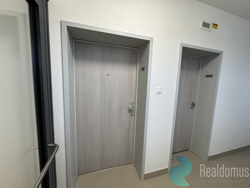 Interiér bytu je řešen promyšleně a s citem pro detail. Vstupní část nabízí vestavěné skříně s velkým úložným prostorem, díky nimž zůstává byt vzdušný a přehledný. Koupelna s toaletou o celkové výměře (5,73 m²) je plně vybavena sprchovým koutem, toaletou, zrcadlem s úložným prostorem a nabízí prakticky řešený prostor připravený pro umístění pračky.