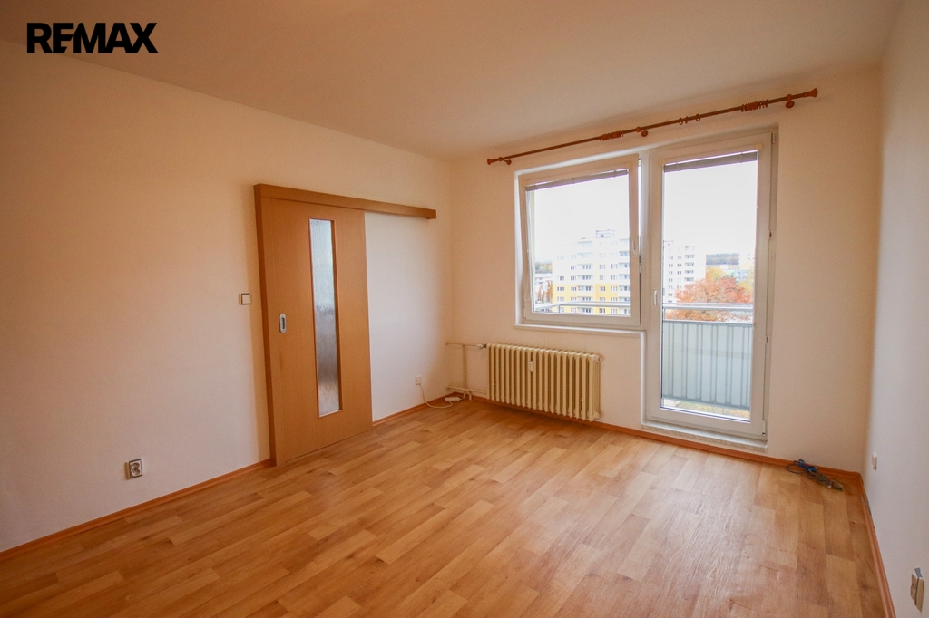 V obývacím pokoji je kuchyňská linka s plynovým sporákem, digestoří a dřezem. Z obývacího pokoje posuvnými dveřmi projdeme do ložnice ze které je vstup na balkon.