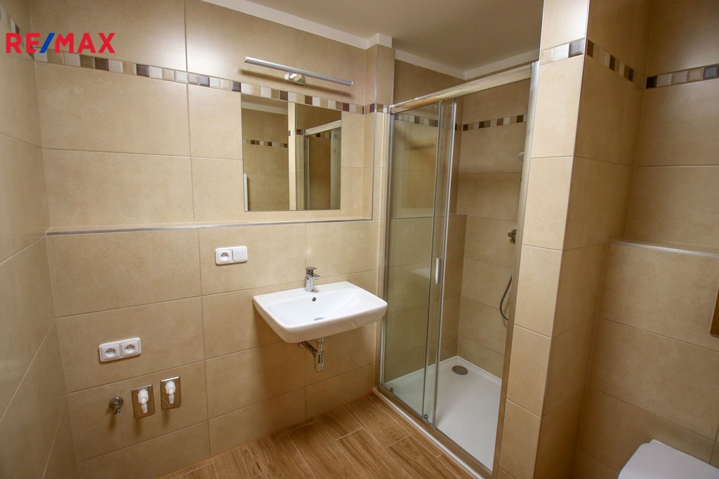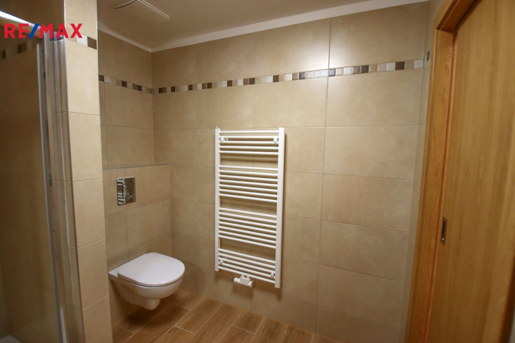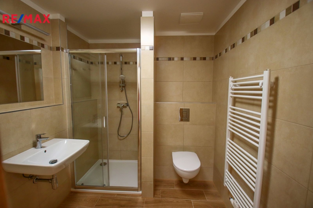 Koupelna o velikosti 5,2 m2 je osazena sprchovým koutem, umyvadlem, WC a otopným žebříkem. Je zde příprava na pračku, případně sušičku.