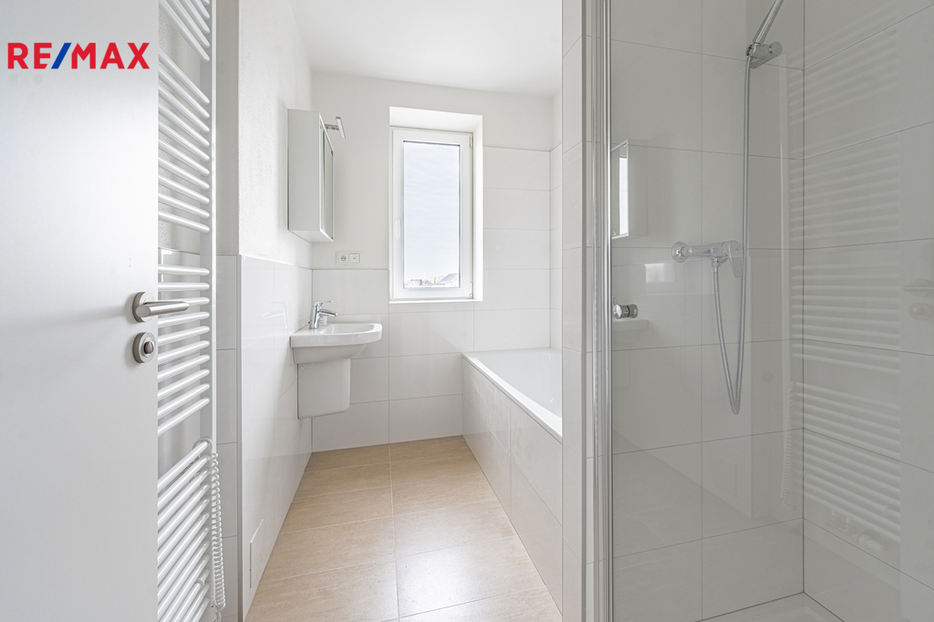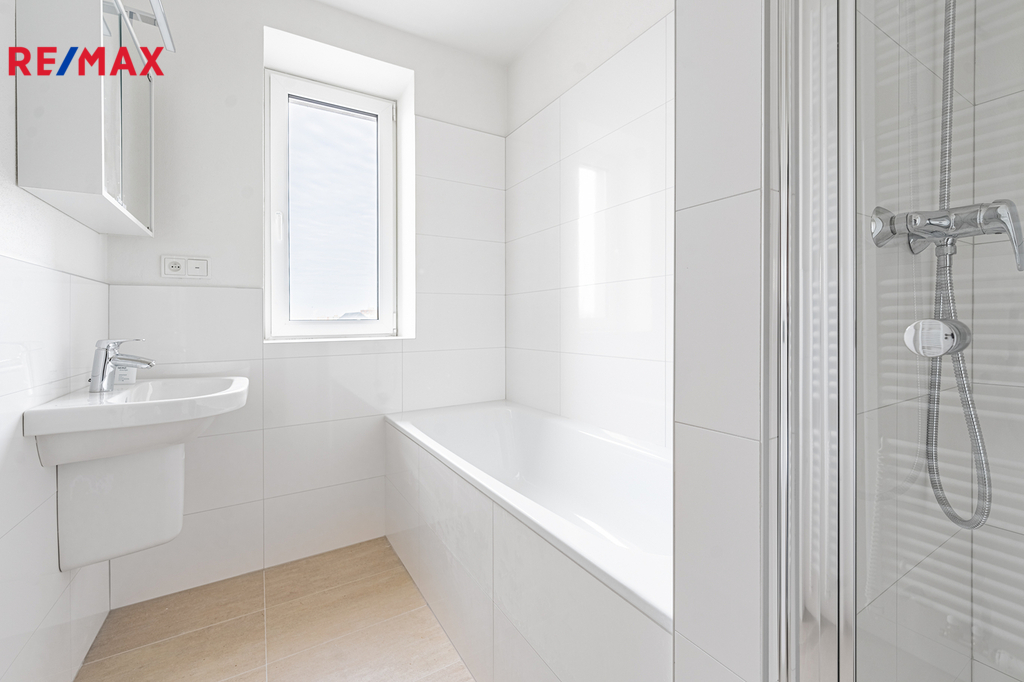 Milovníci horkých koupelí jistě ocení vanu v koupelně. Pro rychlejší očistu je zde k dispozici i sprchový kout. Koupelna je v příjemných, neutrálních barvách. Super je také oddělené WC s bidetem, umyvadlem a prostorem pro pračku a sušičku.