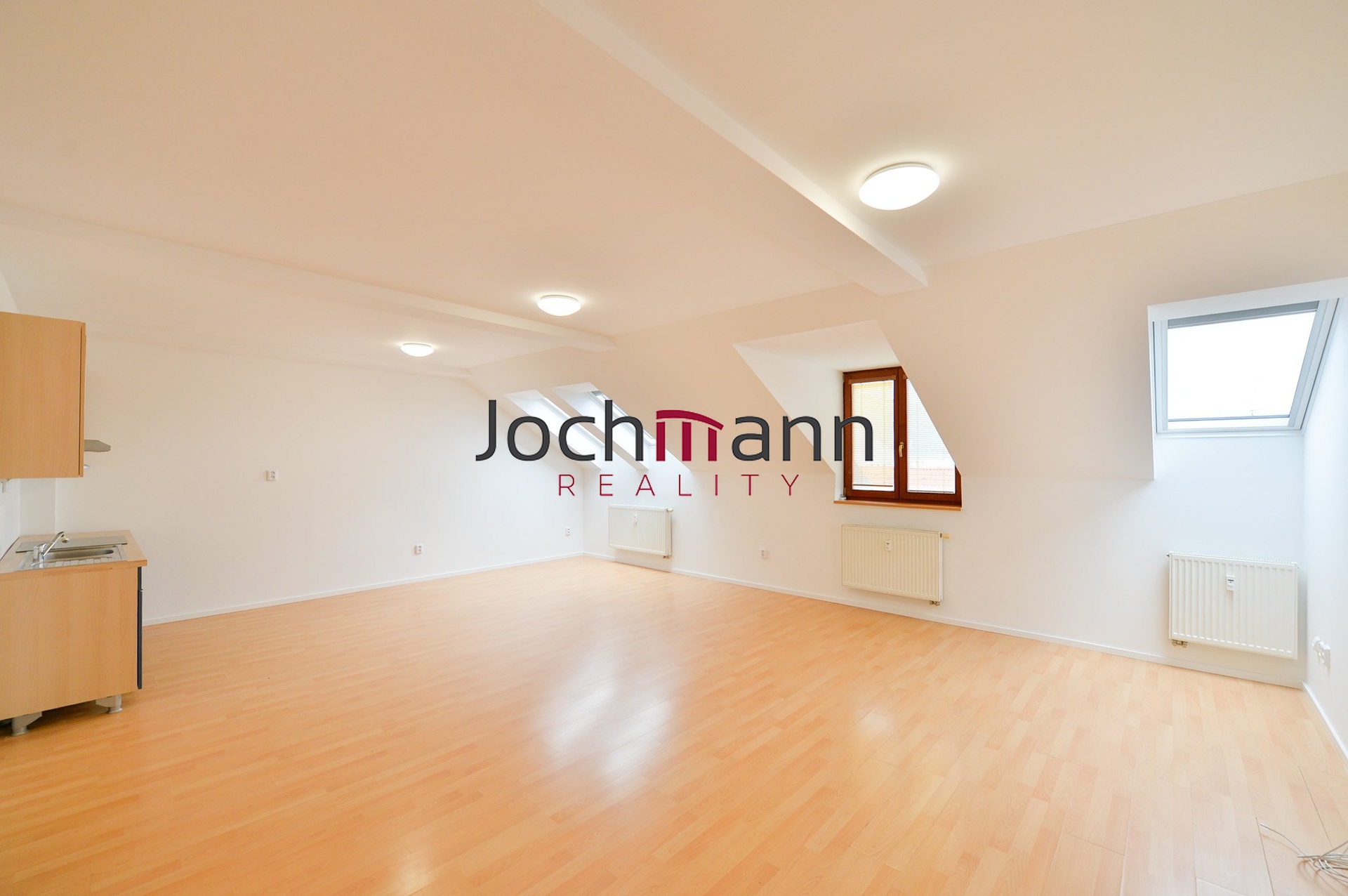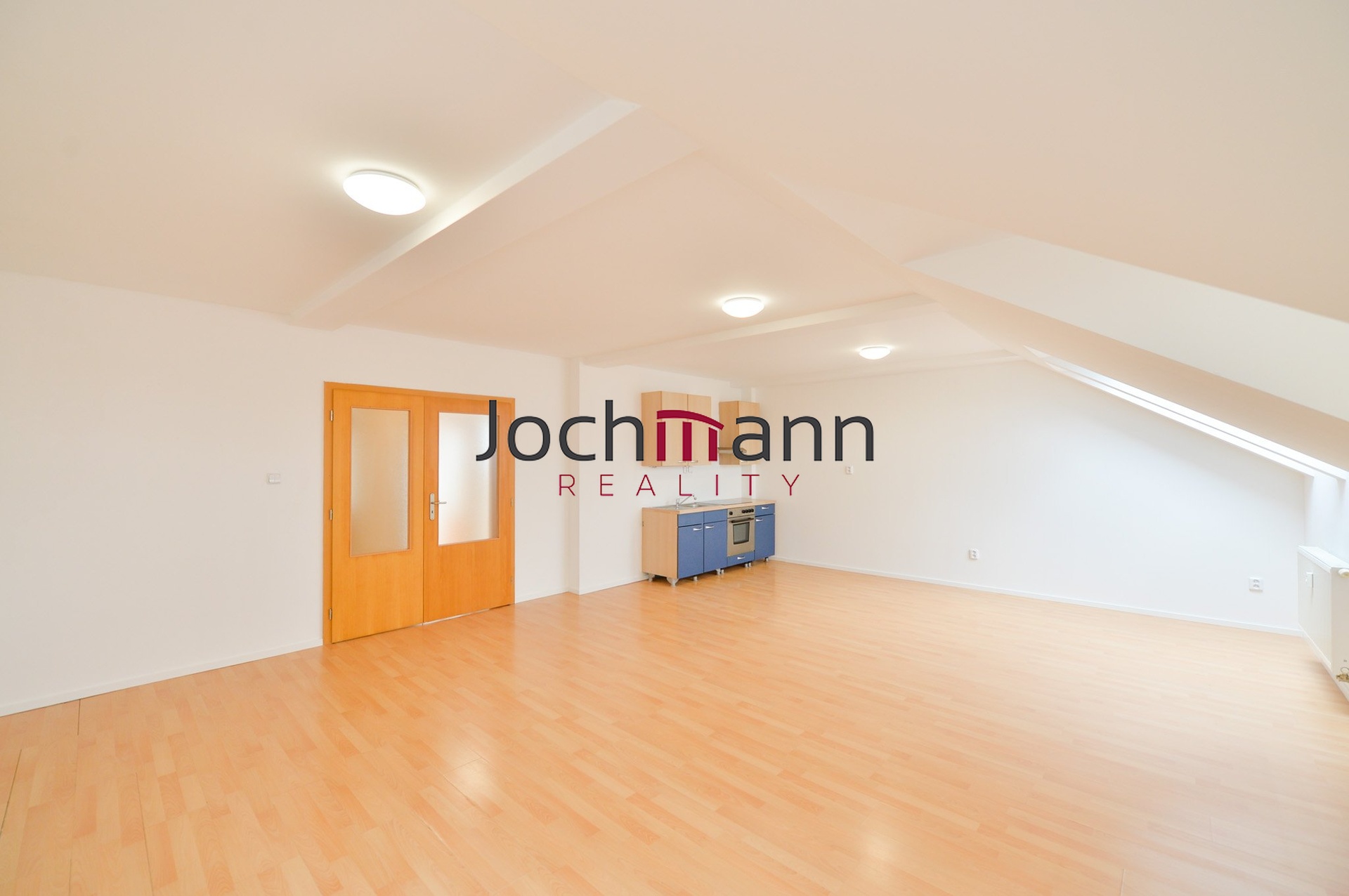 Byt disponuje dvěma samostatnými pokoji, které jsou vybaveny střešními okny, jež zajišťují příjemné prosvětlení. Součástí bytu je také prostorná chodba s vestavěnou skříní, která poskytuje dostatek úložného prostoru. Koupelna je vybavena sprchovým koutem a nabízí prostor pro umístění pračky. Dominantou bytu je velkorysý obývací pokoj propojený s kuchyňskou linkou.