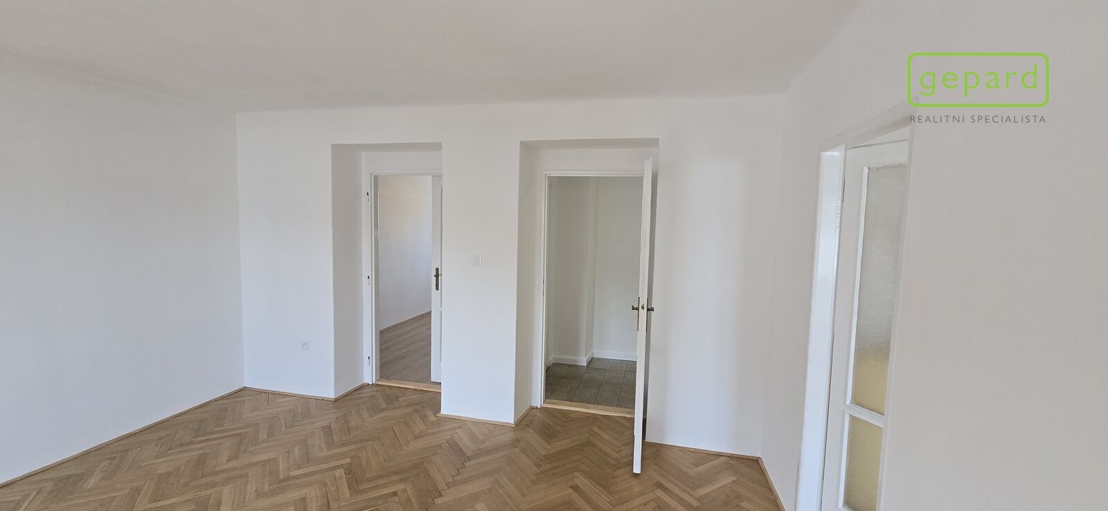 Dispozice: vstup, chodba, vpravo vestavná skříň, komora a koupelna se toaletou, sprchovacím koutem a umyvadlem. Dále se z chodby dostaneme vlevo do dvou samostatných pokojů, které jsou zároveň propojeny dveřmi a z jednoho z nich se dá ještě stejně jako z chodby vstoupit do kuchyně. Ta je vybavena novou kuchyňskou linkou s plynovým sporákem, digestoří a myčkou na nádobí.