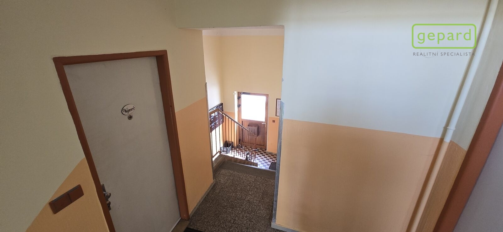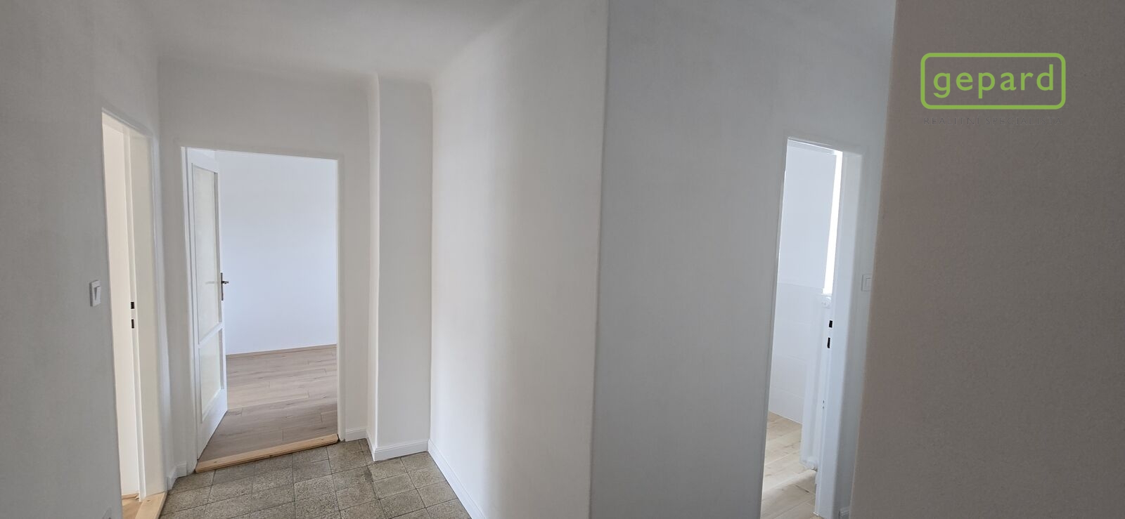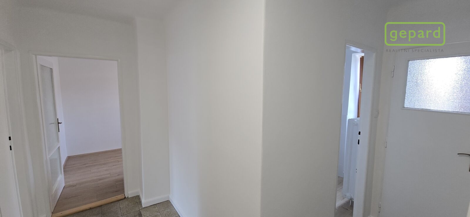 Dispozice: vstup, chodba, vpravo vestavná skříň, komora a koupelna se toaletou, sprchovacím koutem a umyvadlem. Dále se z chodby dostaneme vlevo do dvou samostatných pokojů, které jsou zároveň propojeny dveřmi a z jednoho z nich se dá ještě stejně jako z chodby vstoupit do kuchyně. Ta je vybavena novou kuchyňskou linkou s plynovým sporákem, digestoří a myčkou nádobí.