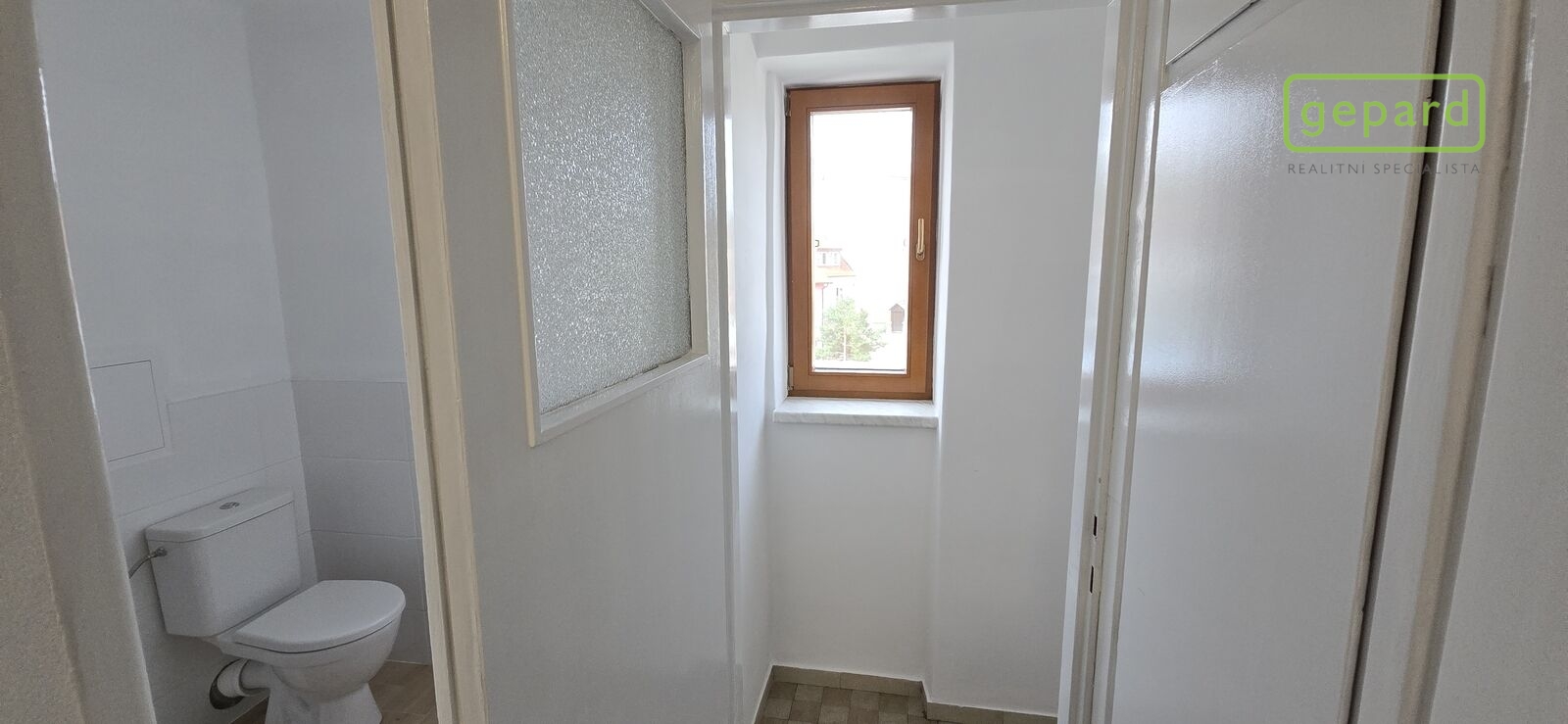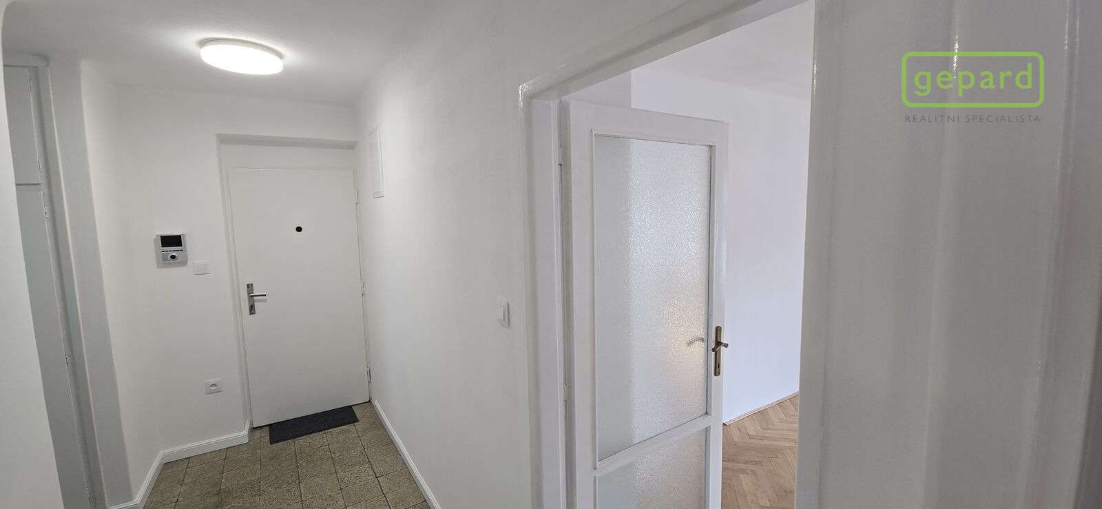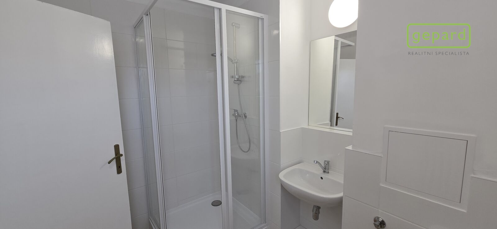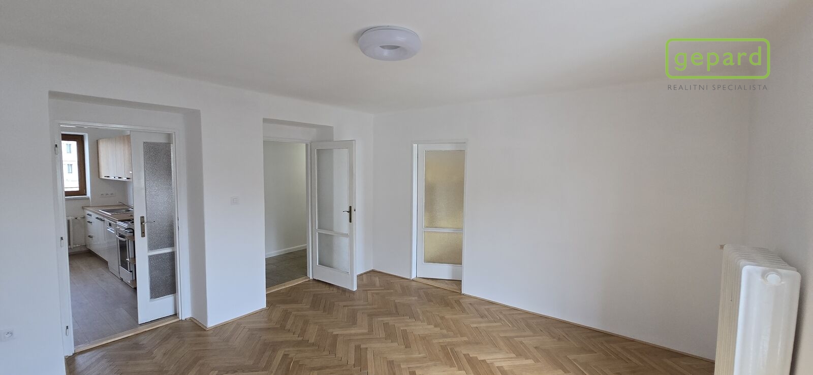 Dispozice: vstup, chodba, vpravo vestavná skříň, komora a koupelna se toaletou, sprchovacím koutem a umyvadlem. Dále se z chodby dostaneme vlevo do dvou samostatných pokojů, které jsou zároveň propojeny dveřmi a z jednoho z nich se dá ještě stejně jako z chodby vstoupit do kuchyně. Ta je vybavena novou kuchyňskou linkou s plynovým sporákem, digestoří a myčkou nádobí.