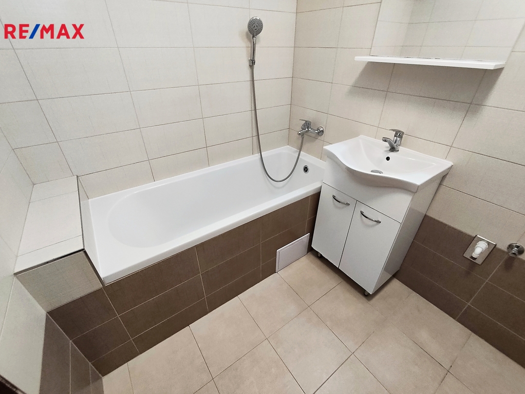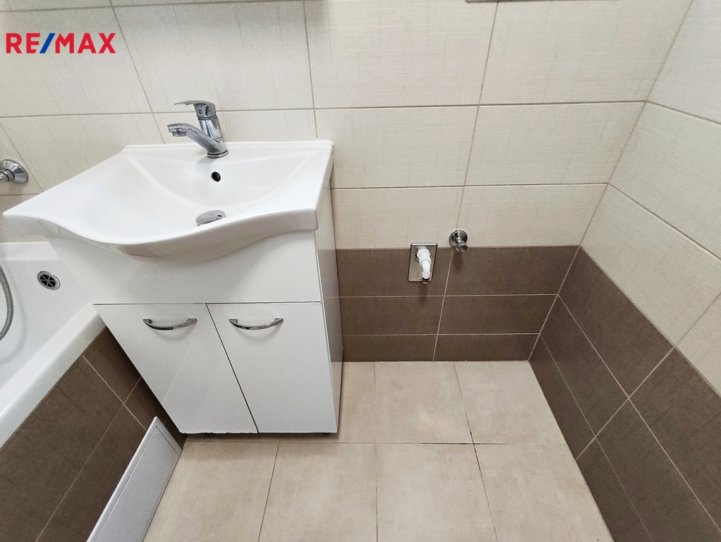 • Koupelna je osazena s vanou, umyvadlem a přípojným místem na pračku