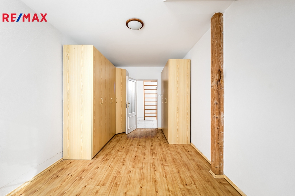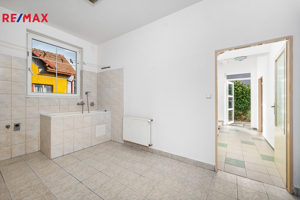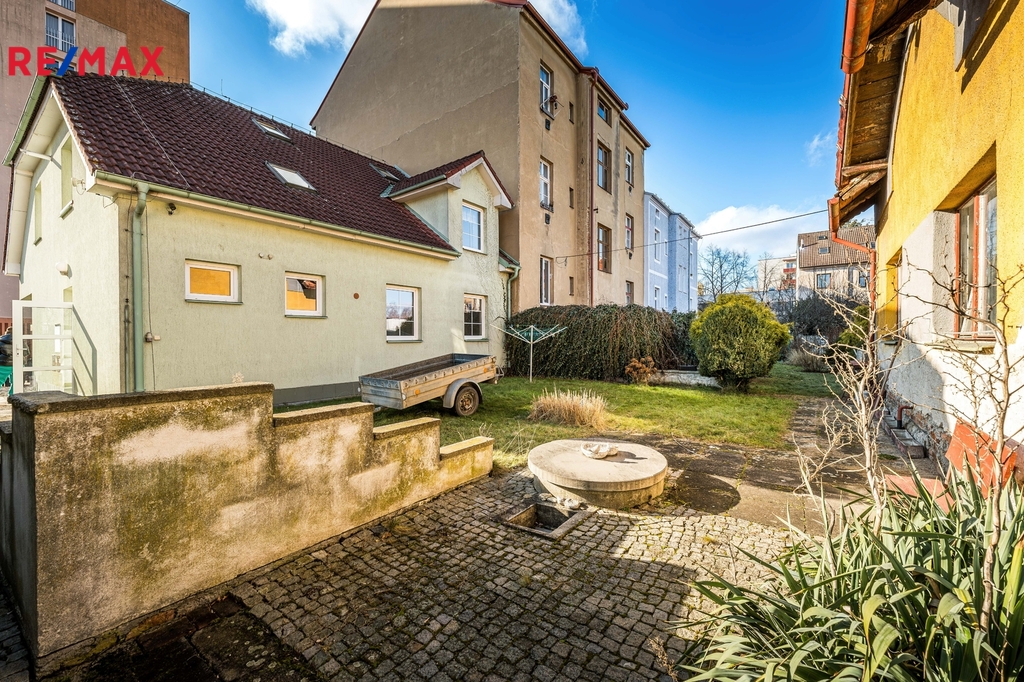 V zadní části pozemku stojí původní stavba nepodsklepeného domu se zvláštním č.p., která je ve velmi špatném technickém stavu, určena k demolici. Na ní navazují dřevěné přístřešky (kolny). Na zadní část pozemku je zvláštním povolením umožněn přístup přes pozemek ve vlastnictví města Č.B.