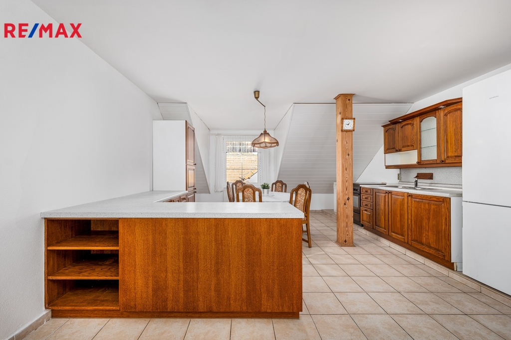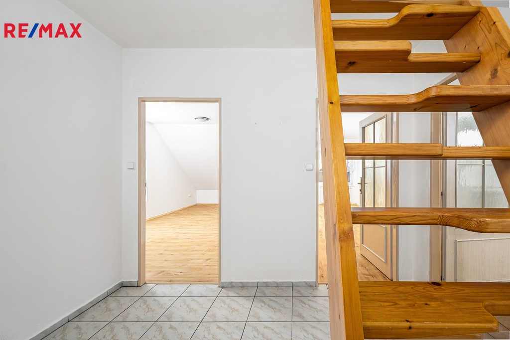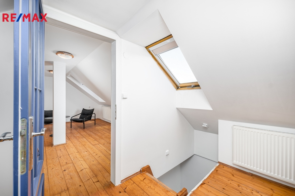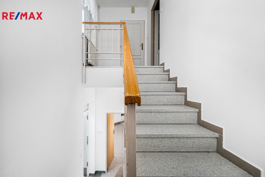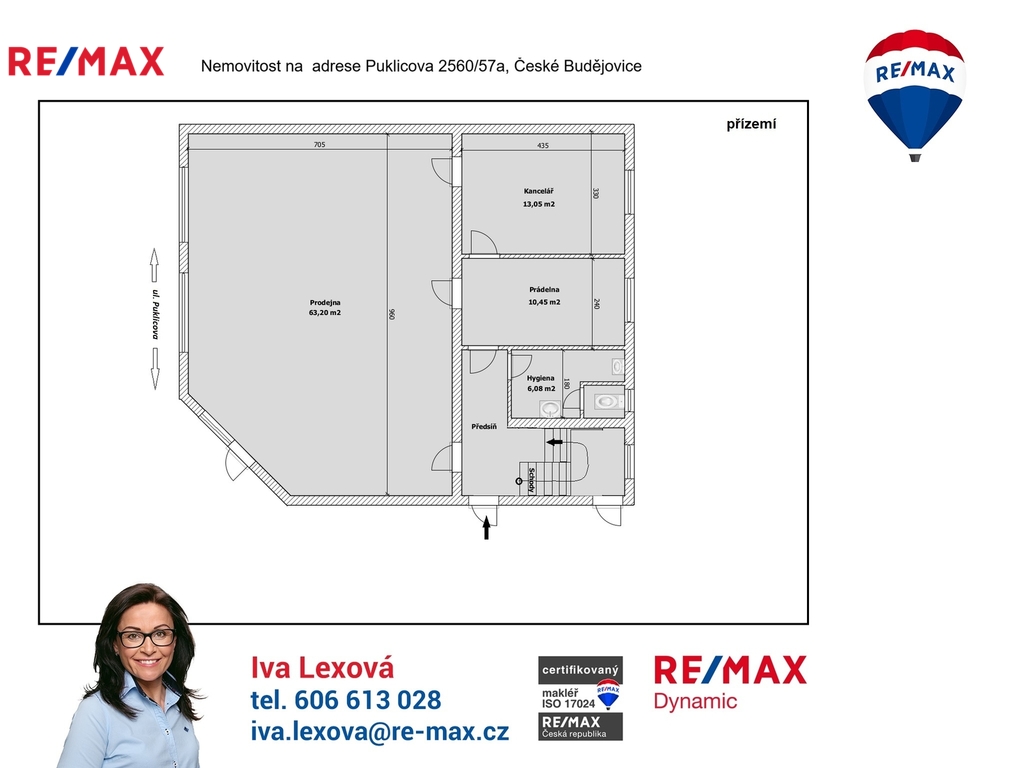 V přední části z Puklicovy ulice se nachází nepodsklepený objekt z r. 2001 o zastavěné ploše 127 m2. V přízemí budovy je nebytový prostor, kolaudovaný jako prodejna textilu se zázemím, které tvoří prádelna, kancelář a sociální zařízení. Samostatným vchodem je přístup do 2. NP, kde se nachází bytová jednotka 3+kk s podlahovou plochou 89 m2. Z bytu je dřevěnými schůdky dále přístup do podkrovní místnosti s plochou 27 m2. Vytápění domu je řešené ústředními rozvody, zdrojem tepla i ohřevu vody je plynový kotel. Dispoziční řešení objektu najdete na přiloženém orientačním půdorysu.