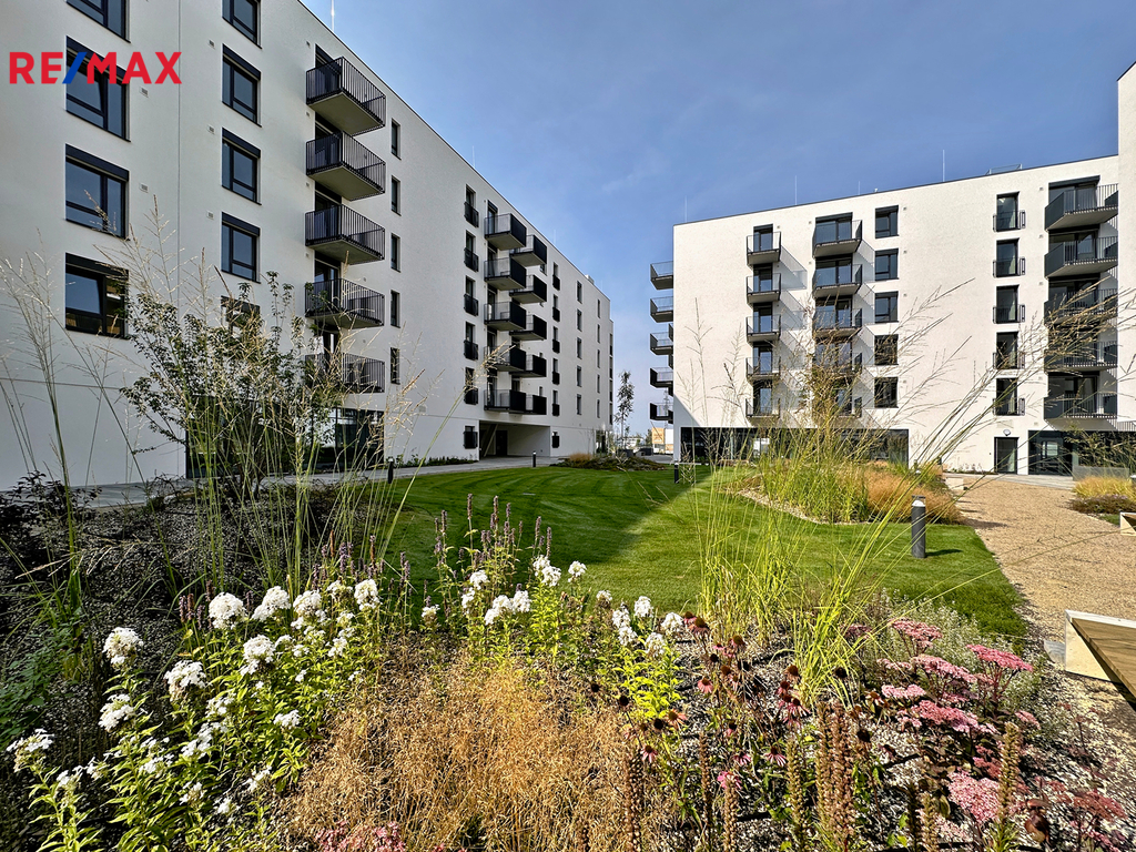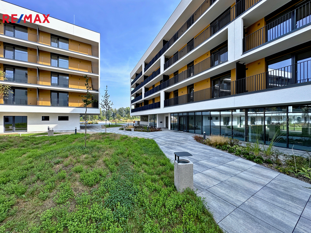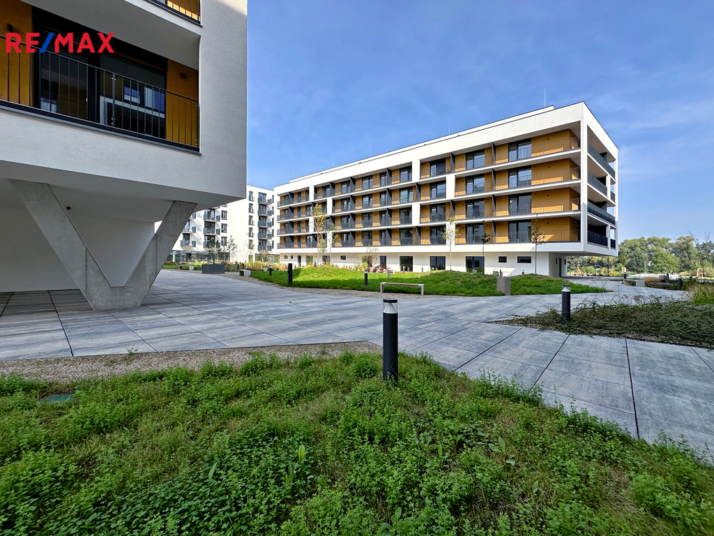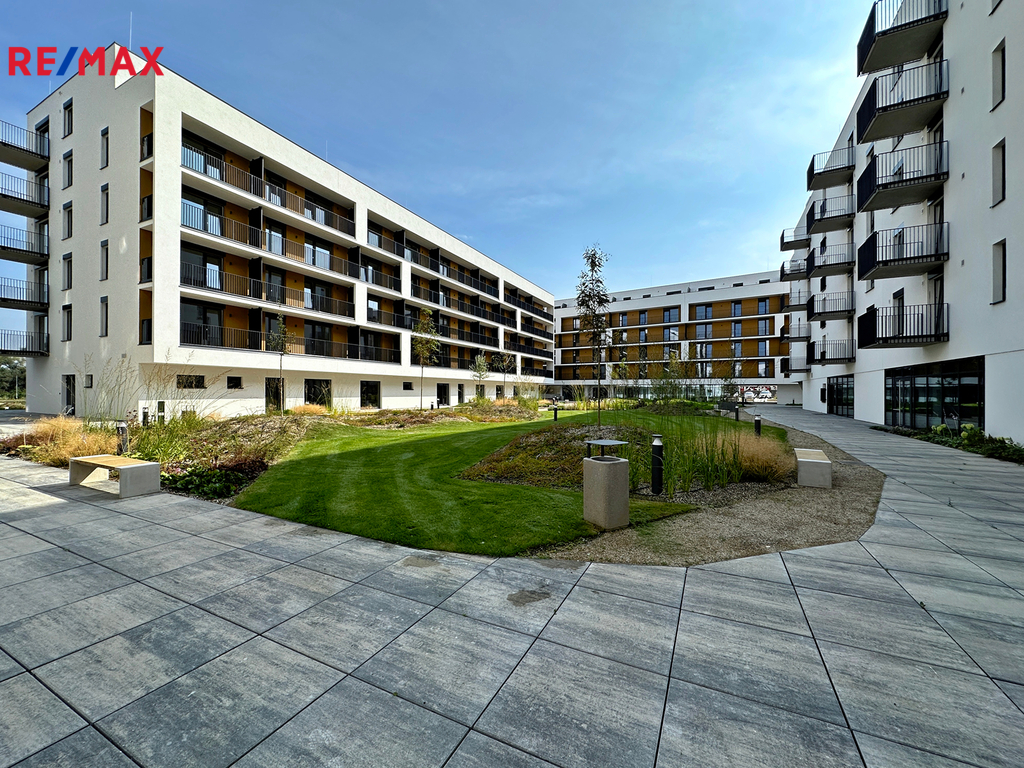Veřejné prostranství je navrženo udržitelně – zelené střechy spolu s atriem pomáhají optimalizovat mikroklima budov. Součástí projektu je také cyklostezka, kolárna a myčka kol.