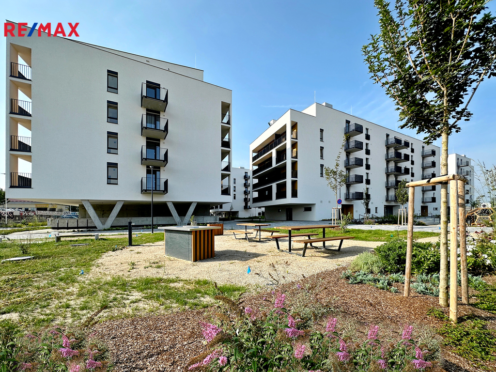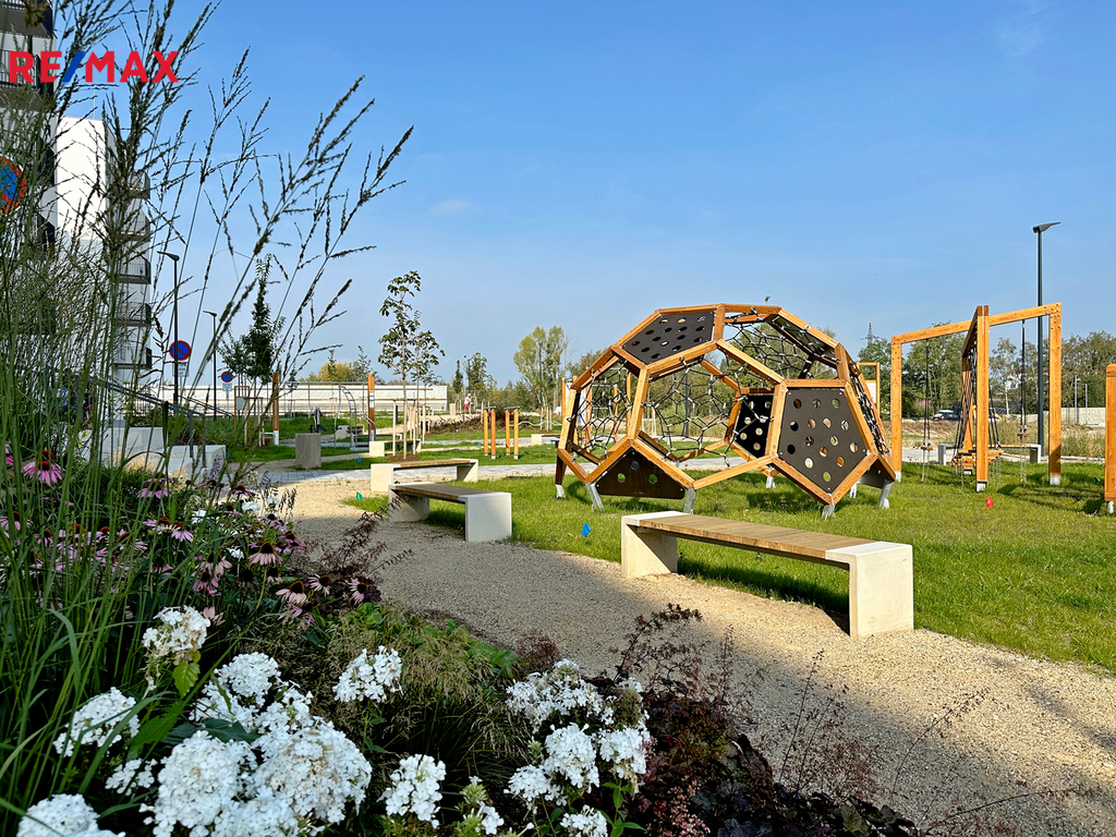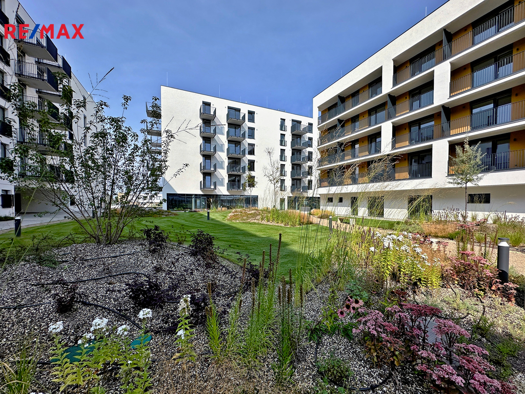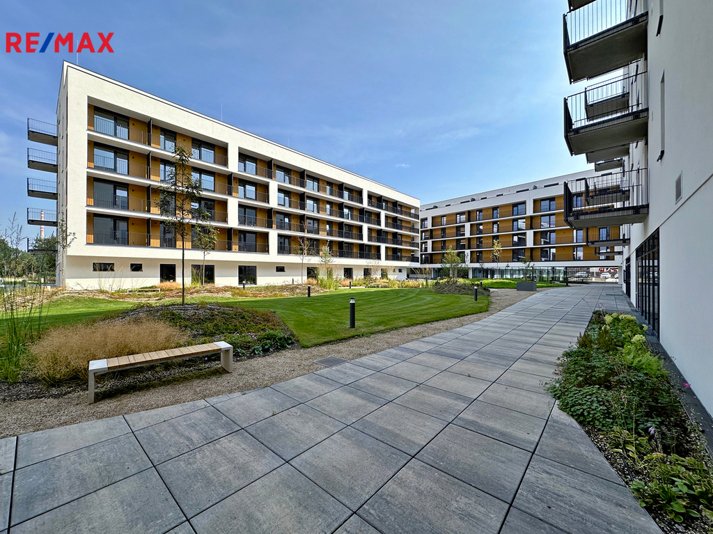 Veřejné prostranství je navrženo udržitelně – zelené střechy spolu s atriem pomáhají optimalizovat mikroklima budov. Součástí projektu je také cyklostezka, kolárna a myčka kol.