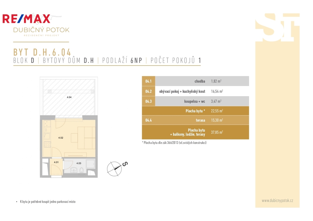 Nabízíme exkluzivní bytovou jednotku 1+kk (D.H.6.04) v rezidenci Dubičný Potok v Českých Budějovicích. Toužíte po malém, ale dokonale funkčním bytě, který nabízí něco navíc? Tato jednotka o velikosti 22,55 m² vás překvapí svým promyšleným dispozičním řešením i atmosférou. Hlavní hvězdou je terasа o úžasných 15,30 m² — téměř tak velká jako samotný byt. Vytváří pocit, že máte k dispozici další obytný prostor navíc. K dispozici na ní máte venkovní osvětlení, el. zásuvku a nezámrzný ventil na vodu.