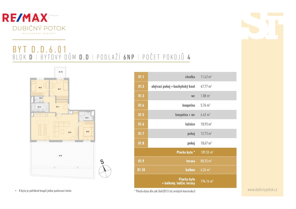 Nabízíme exkluzivní střešní bytovou jednotku 4+kk (D.D.6.01) o ploše 109,55 m² s jižně orientovanou terasou 80,35 m² a balkonem do vnitrobloku 4,24 m2 v rezidenci Dubičný Potok v Českých Budějovicích.