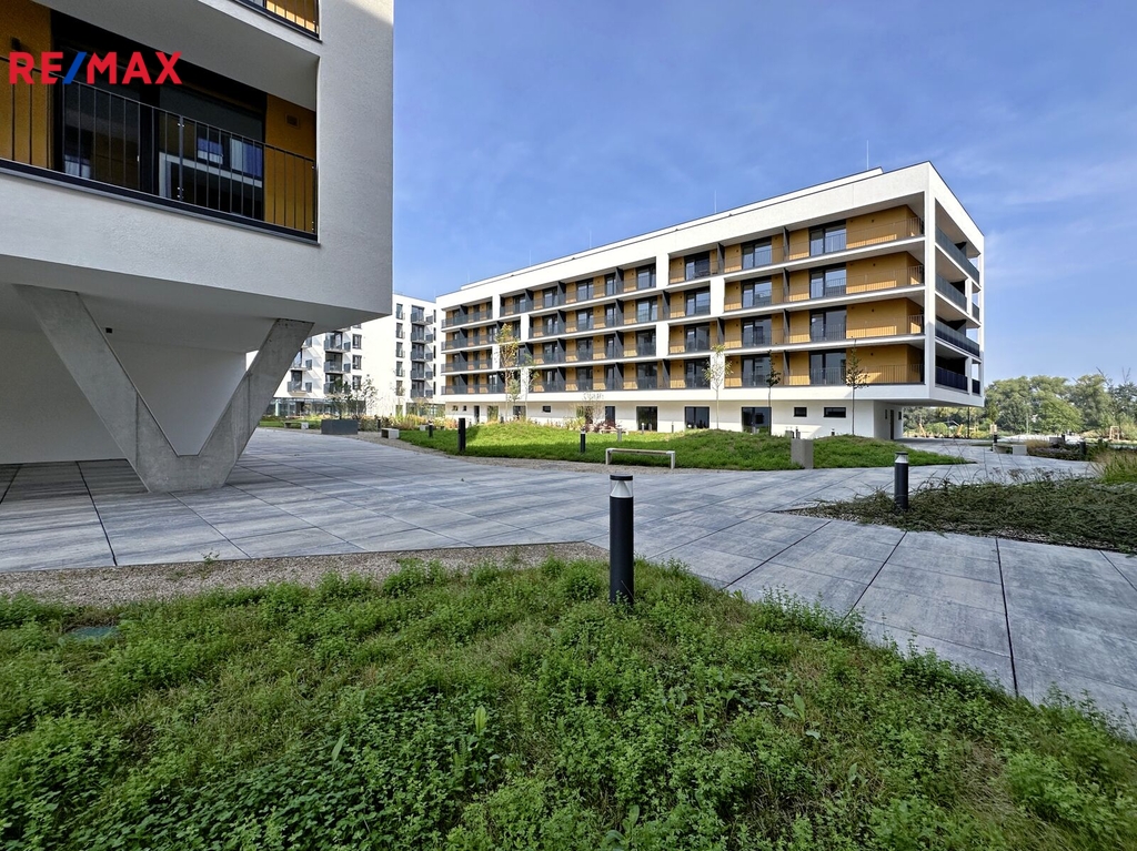 Veřejné prostranství je navrženo udržitelně – zelené střechy spolu s atriem pomáhají optimalizovat mikroklima budov. Součástí projektu je také cyklostezka, kolárna a myčka kol.