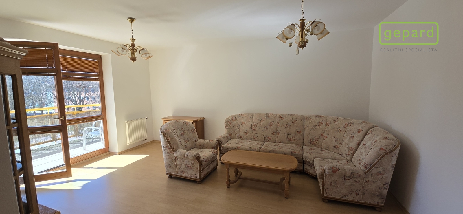 Byt je ve třetím patře domu a dispozičně je řešen takto: Vstup, chodba, hala ze které se dostaneme do velké skladovací komory. První samostatný pokoj se vstupem na lodžii s posezením a výhledem na okolí, dále zděná koupelna se sprchovacím koutem, vedle samostatná toaleta. Pokračujeme do prostorného obývacího pokoje spojeného s kuchyňským koutem a plně vybavenou kuchyňskou linkou vestavnými spotřebiči. V prostoru za kuchyní je další úložná komora.