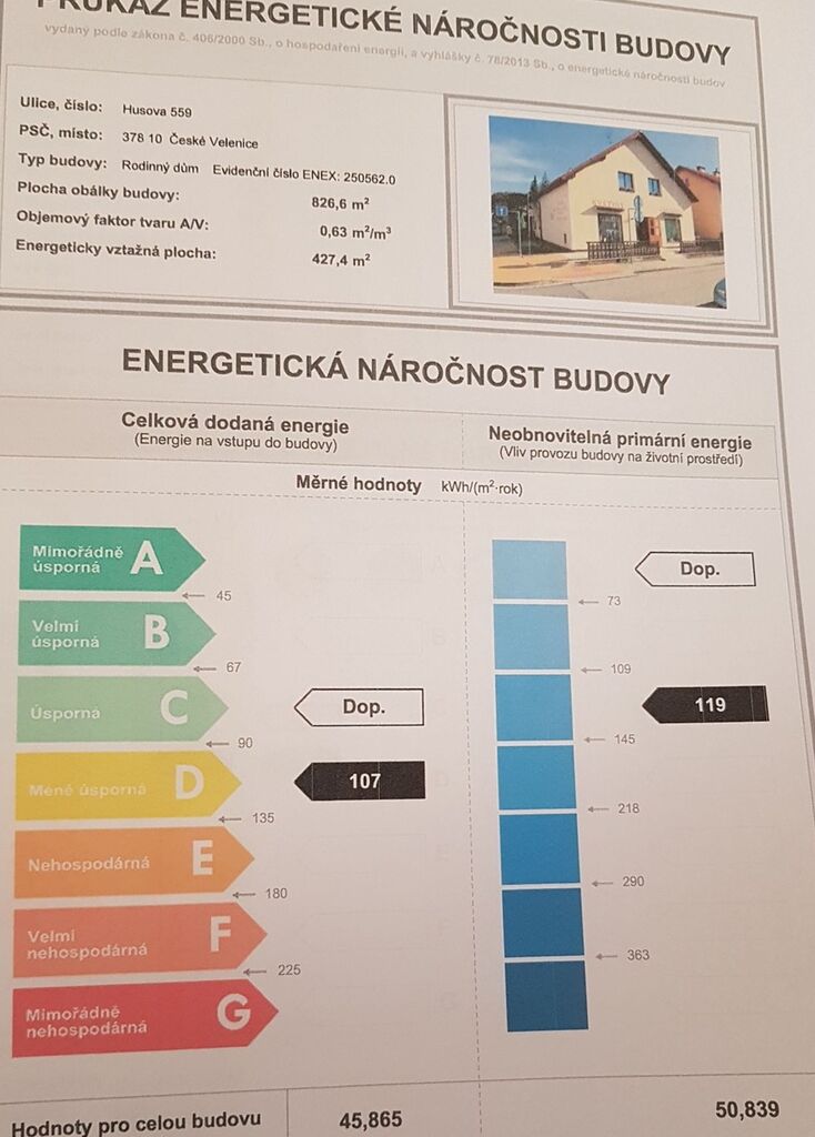 - Ukazatel energetické náročnosti budovy: 107 kWh/m²