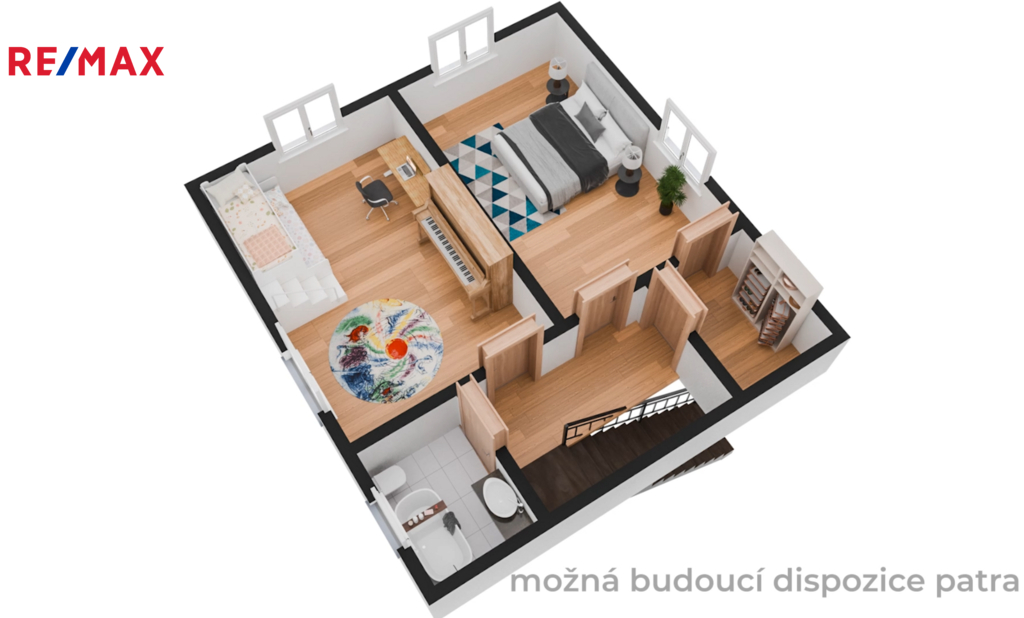 K dispozici je též úžasný podkrovní prostor, kam se nepochybně vejdou i pokoje další - pro rodinu větší anebo vícegenerační.