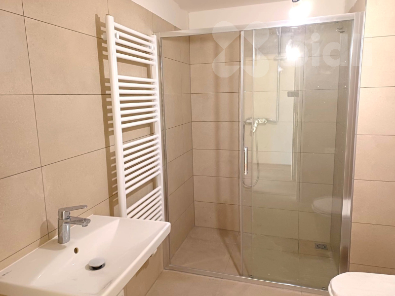 Dále se z předsíně vstupuje do koupelny se sprchovým koutem, toaletou a umyvadlem, zařízené keramikou v přírodních nadčasových tónech.