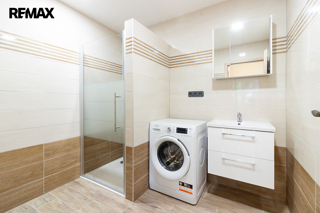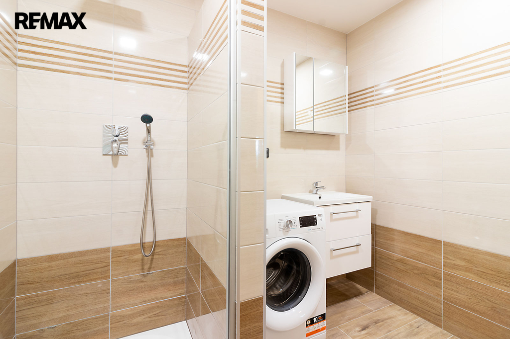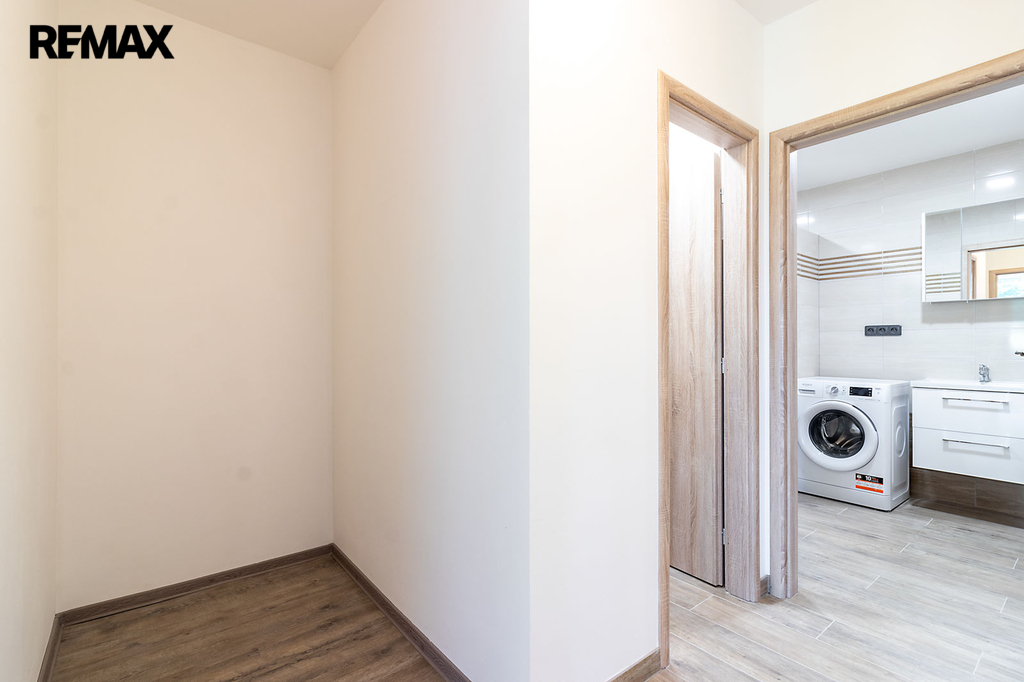 Byt je částečně vybavený – kuchyňská linka s vestavěnými spotřebiči (lednice, mrazák, trouba, varná deska, digestoř a myčka), velká šatní skříň, botník, věšák, pračka. Na oknech jsou namontovány venkovní žaluzie.
