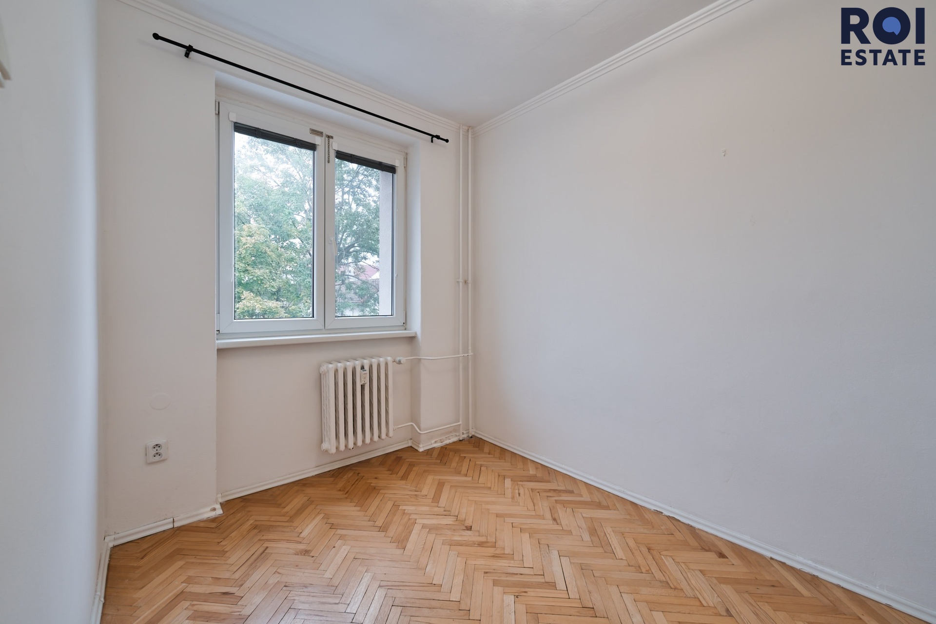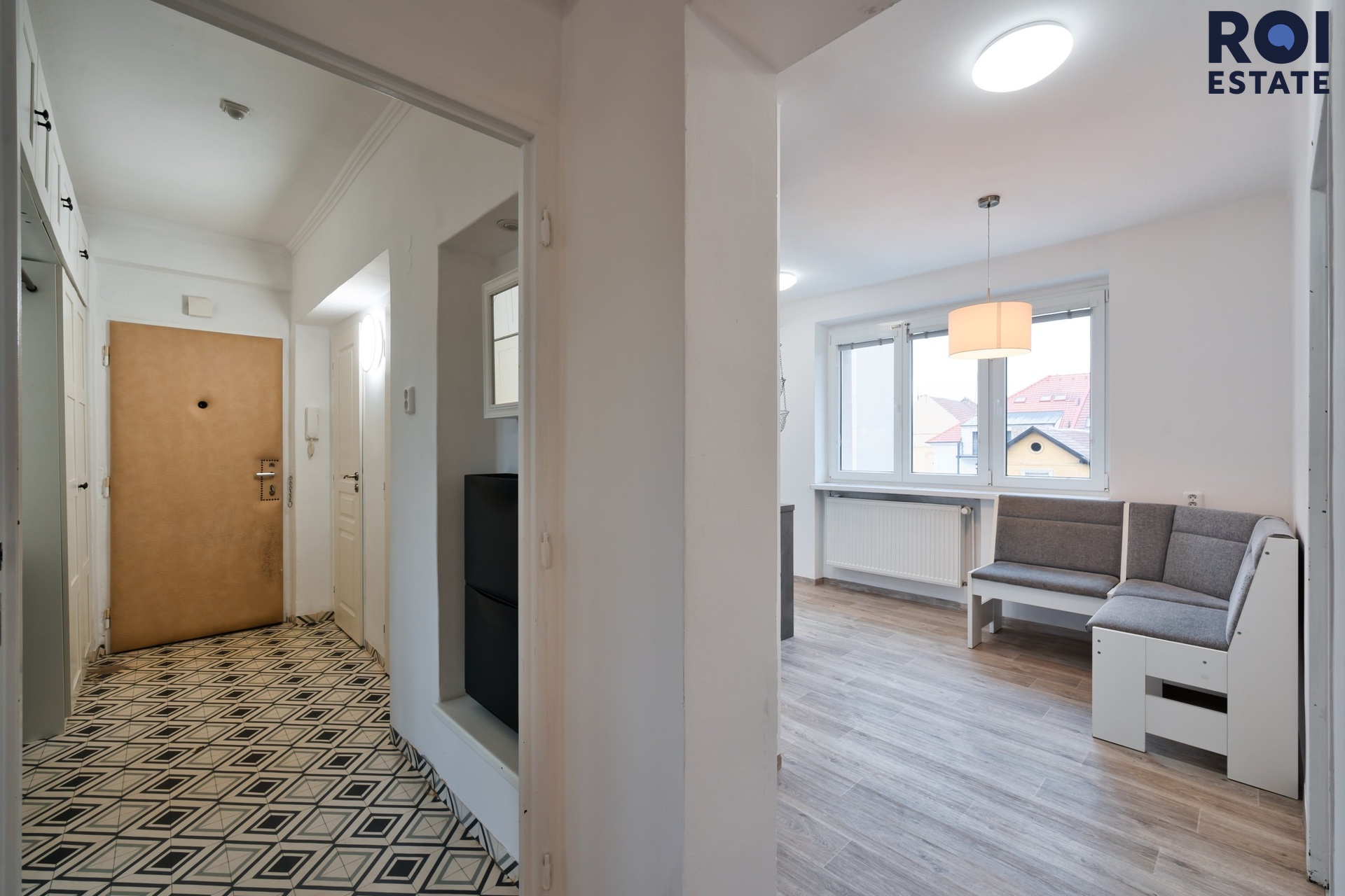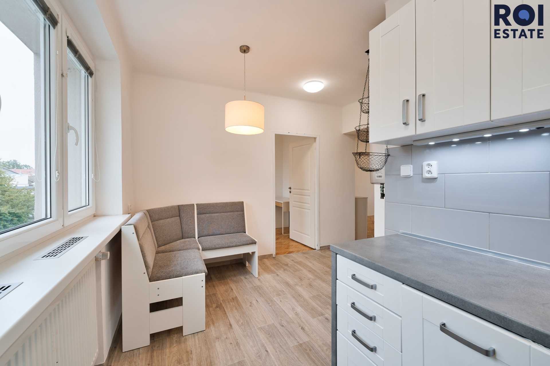 Dispozici tvoří plně vybavená kuchyň (myčka nádobí, trouba, plynová varná deska, lednice a jídelní sezení), obývací pokoj a dvě samostatné ložnice. Koupelna je vybavena sprchovým koutem, toaleta je samostatná. K bytu náleží zasklená lodžie a sklepní kóje. Parkování je možné pohodlně na ulici před domem.
