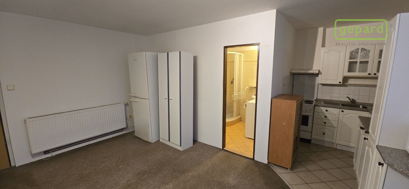 Dispozice: vstup na chodbu, která je součástí nájmu, dále vchod do samotného bytu, jeden velký prostor s kuchyňským koutem a samostatnou koupelnou. V koupelně je sprchovací kout a toaleta. Vytápění zajišťují radiátory připojené na centrální systém vytápění.