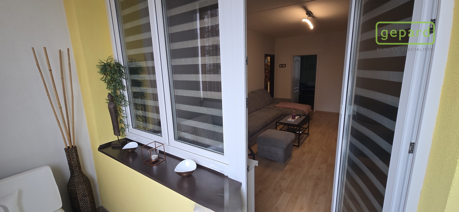 Na konci haly je vstup do obývacího pokoje (20,30m2) s výstupem na zasklenou lodžii (4,15m2) s výhledem na sídliště a přilehlé parkoviště.