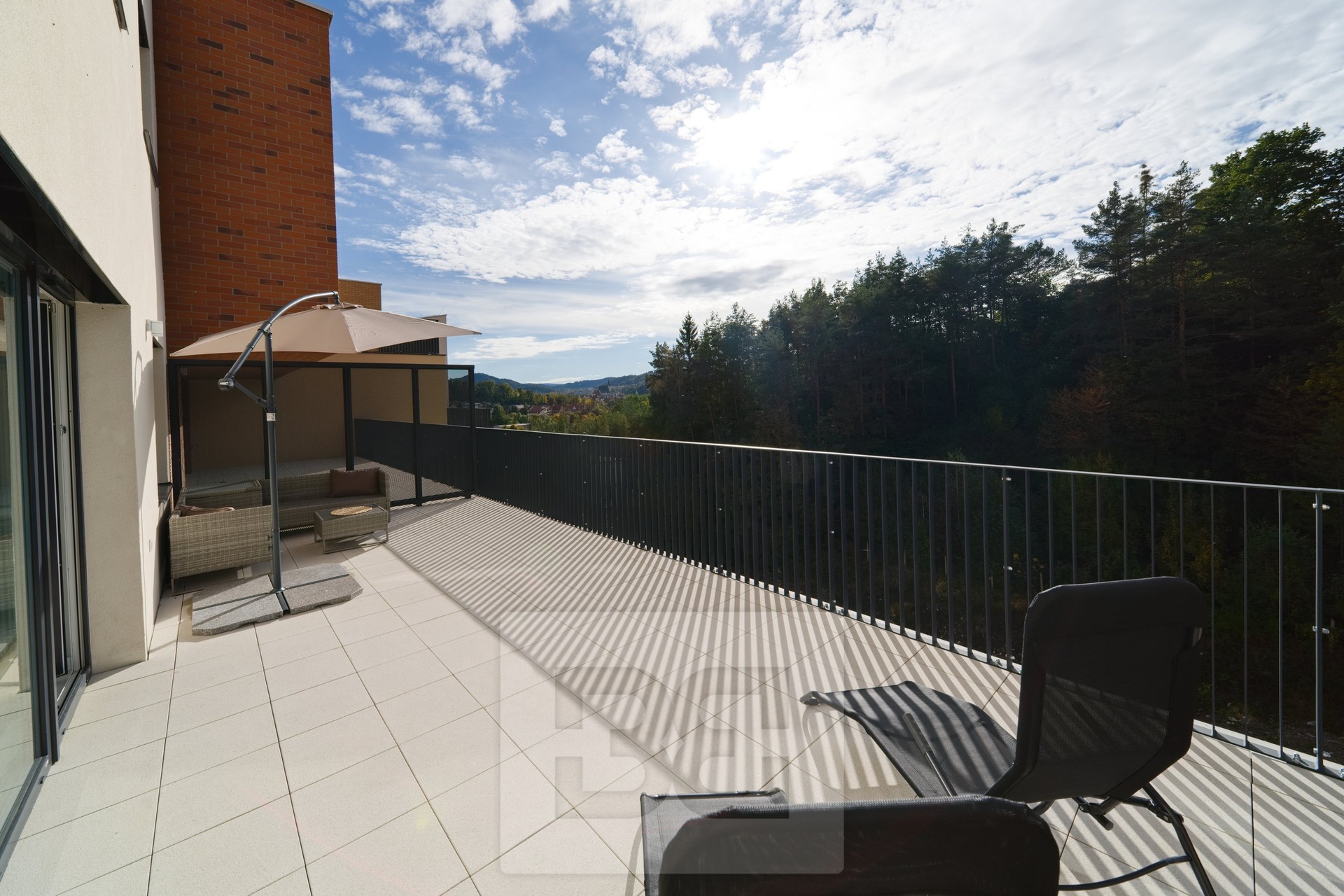 Z terasy si můžete užívat krásný výhled na okolní krajinu. K bytu patří také vyhrazené garážové stání, což je velkou výhodou v této lokalitě. Budete mít výbornou dopravní dostupnost a spoustu možností pro aktivní trávení volného času v okolí.