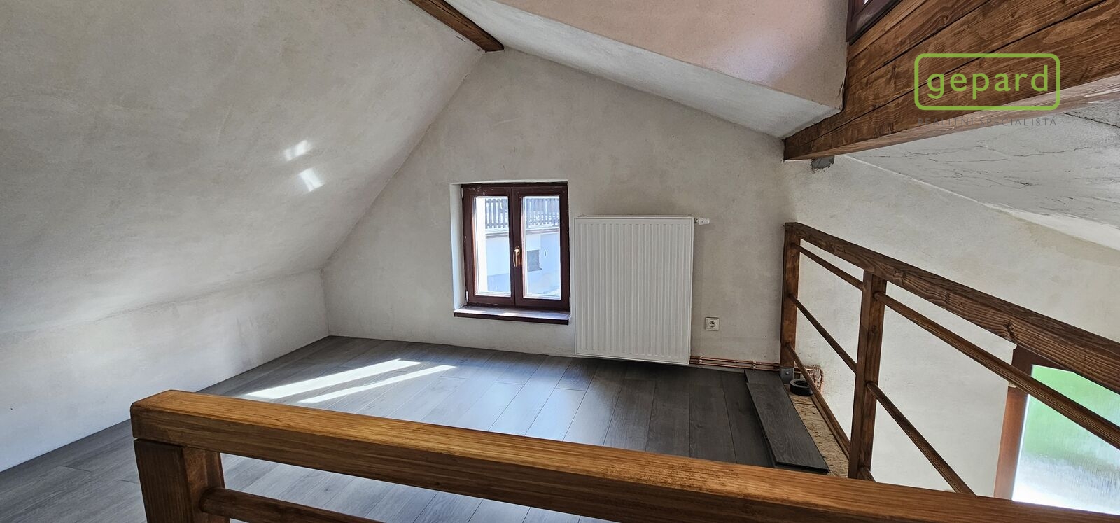 Naproti schodišti je dále v patře koupelna se sprchovacím koutem a toaletou. Chodba pokračuje do menšího pokoje a navazující ložnice. Z těchto pokojů je taktéž výhled na město. Podlahová krytina dlažba a plovoucí, nová dřevěná okna, masivní interiérové dveře, nové rozvody elektřiny, vody a topení. Vytápění je zajištěno tepelným čerpadlem a ústředním topením s měsíčním nákladem cca 3 000,- Kč.