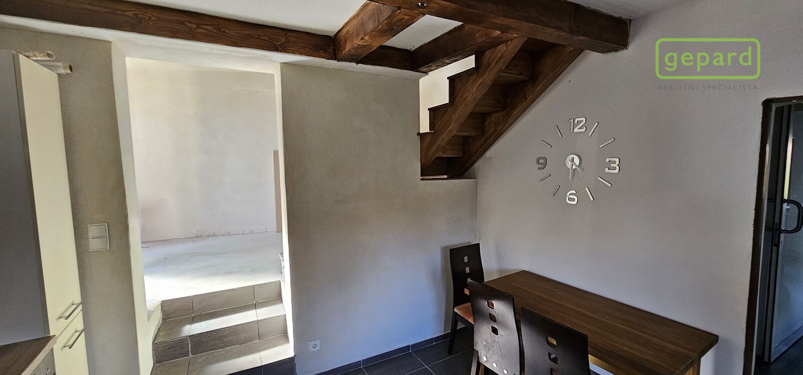 Druhá část domu má samostatný vstup ze zahrady za domem, tak i vstupem z kuchyně v patře domu, kterým se dostaneme do první místnosti, která může sloužit například jako pracovna.