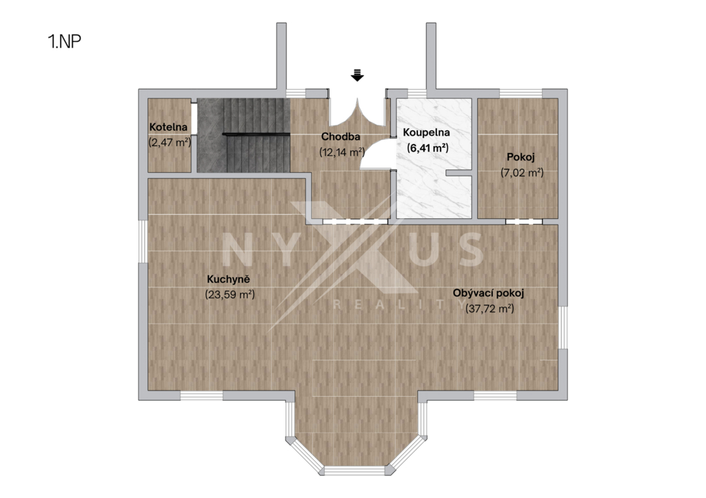 Dům poskytuje výjimečný prostor, soukromí a komfortní zázemí pro rodinné bydlení. Přízemí o velikosti 99 m² sestává z vstupní chodby, koupelny, technické místnosti a především velkým otevřeným obytným prostorem, který propojuje kuchyni, jídelnu, pracovnu a obývací pokoj s krbem. Z této části domu je přímý vstup na zasklenou terasu 9 m² s krásným výhledem do zahrady.