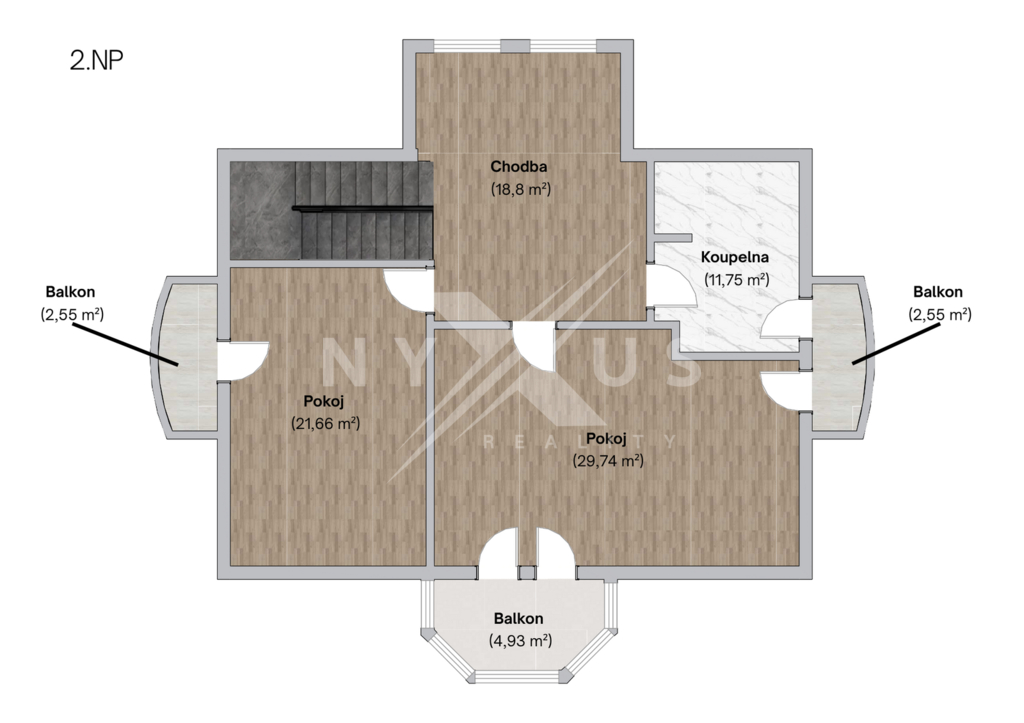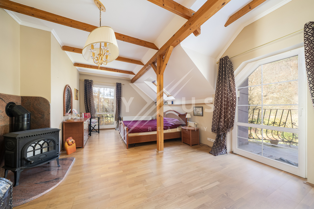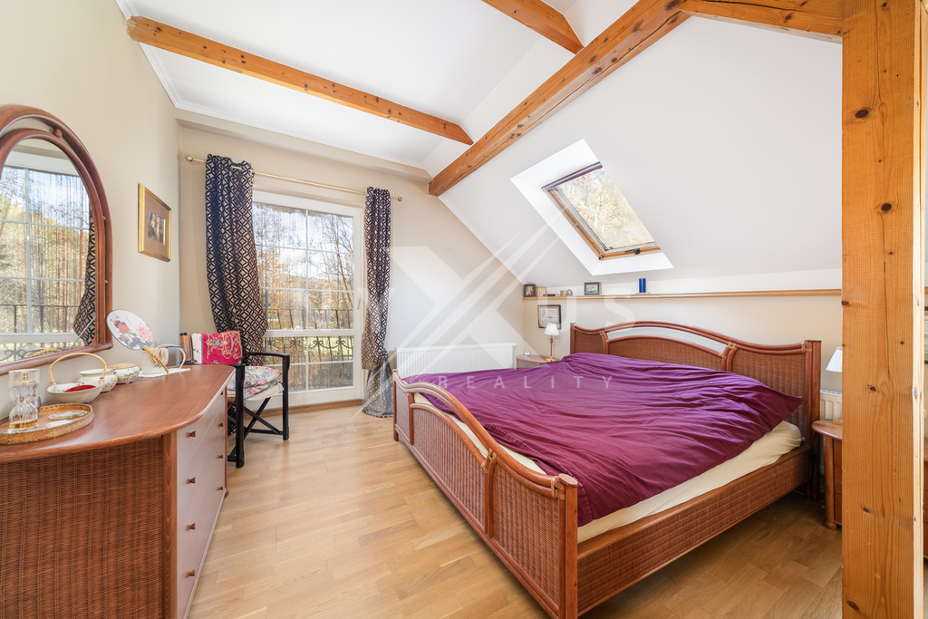 V patře o užitné ploše 82 m² se nachází prostorná hala, koupelna s vanou a dvě útulné ložnice, z nichž každá má vlastní balkon o velikosti 3 m² a kamna na dřevo.