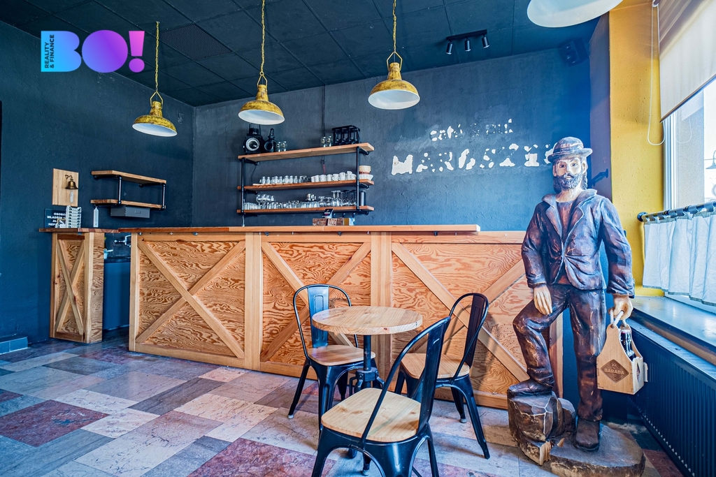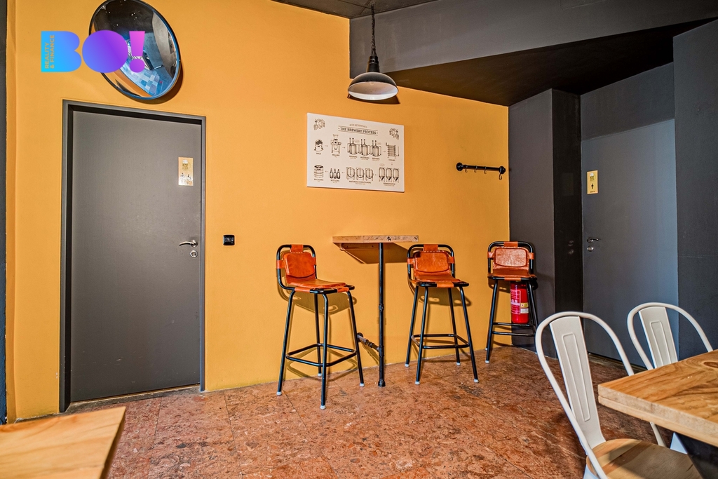 Interiér působí výrazně osobitě. Kombinace cihelné stěny, tmavých tónů, dřeva a kovových prvků vytváří prostor, který hosté nezapomenou. Dominantou je plně vybavený bar s otevřenými policemi a stylovým čelním obložením. Velká okna směřující do ulice přinášejí denní světlo a zároveň zajišťují skvělou prezentaci podniku směrem ven.