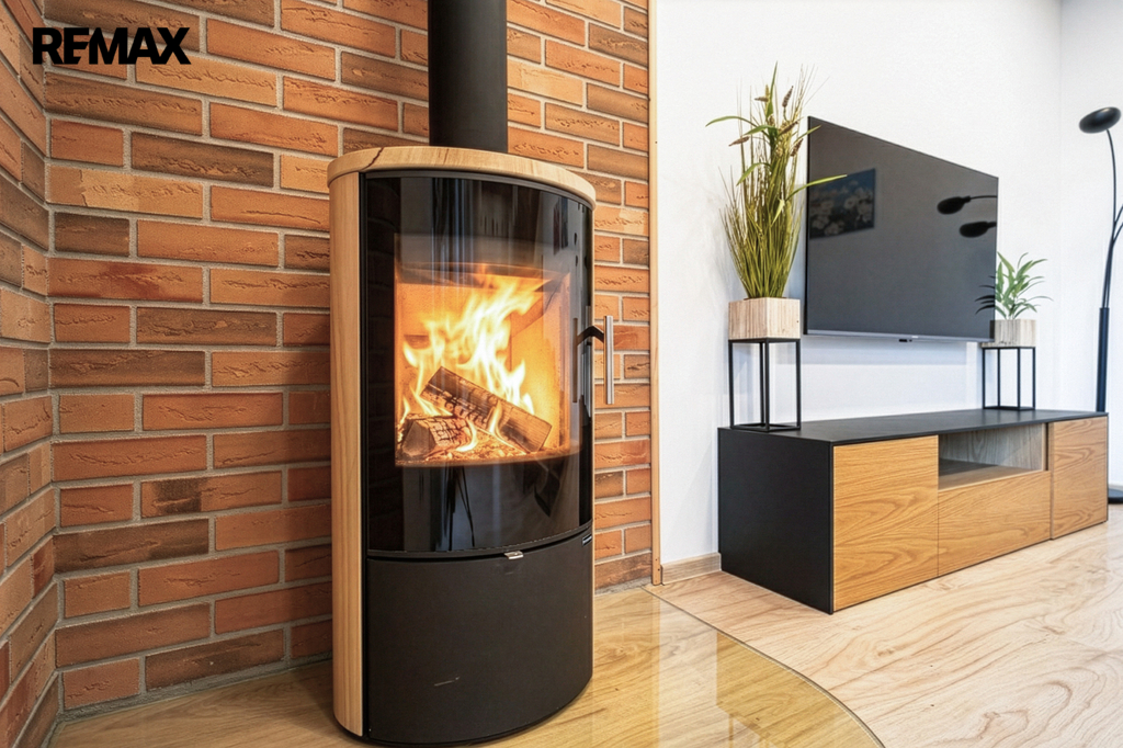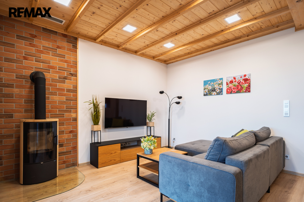 V přízemí domu se kromě zázemí a ložnice nachází otevřený obytný prostor plný světla. Dominantou jsou designová krbová kamna, která vytvářejí skutečné teplo domova a příjemnou atmosféru.
