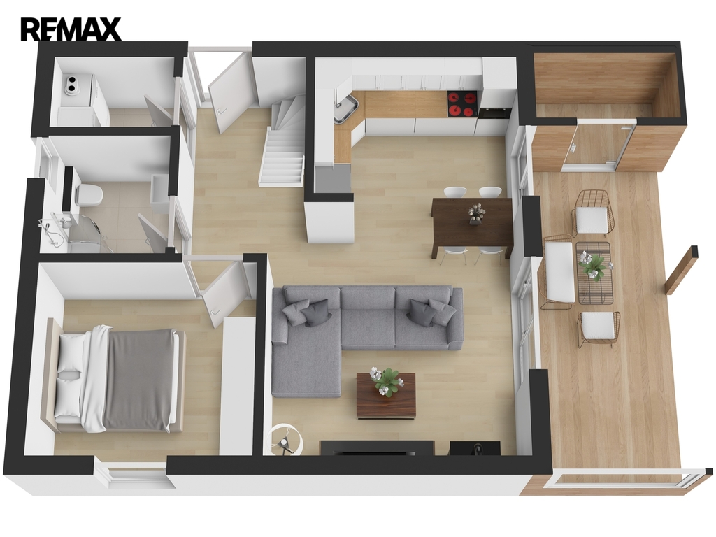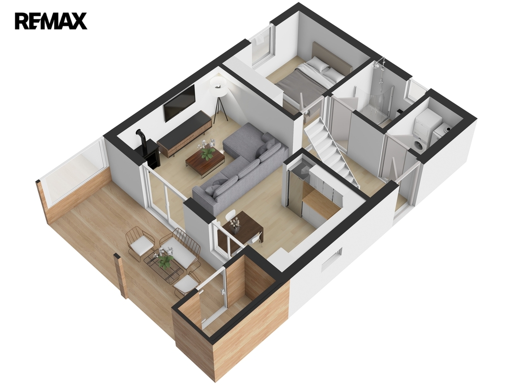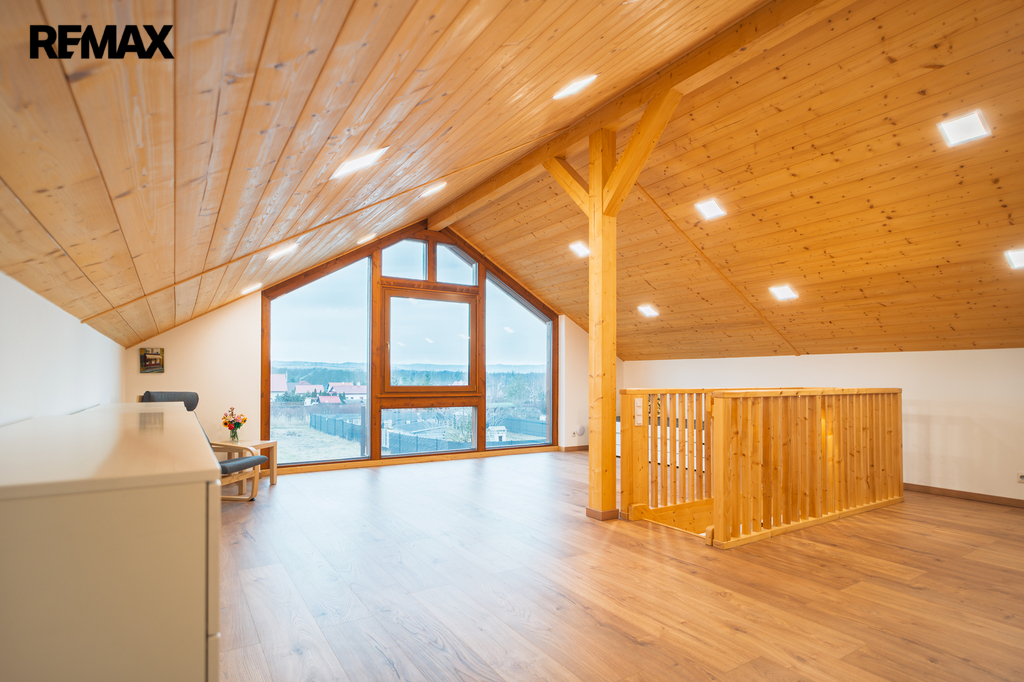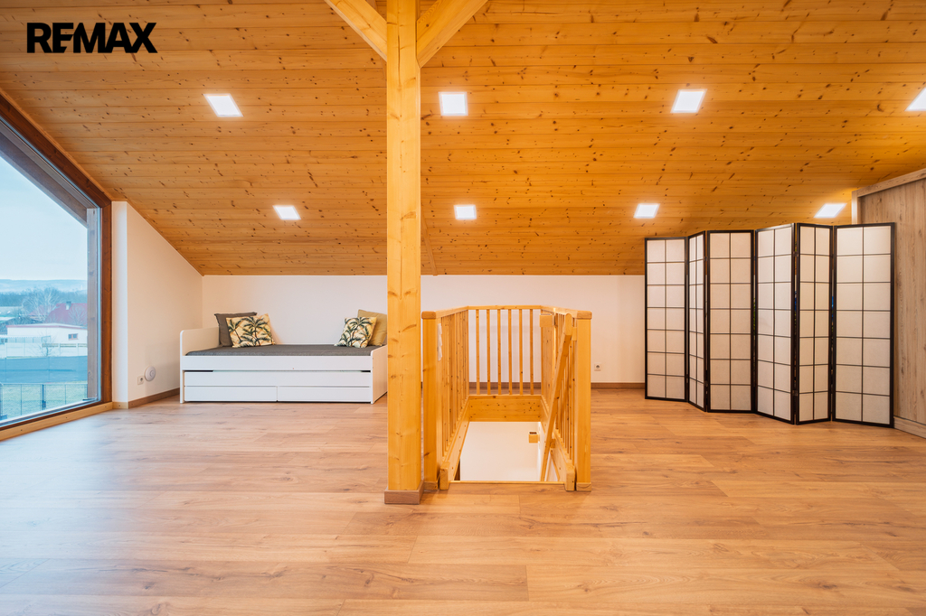 V patře vás čeká velkorysý otevřený prostor s prémiovou podlahou. Dominantou horního patra je velkorysé panoramatické okno, které přivádí do interiéru dostatek denního světla a nabízí nádherný výhled do krajiny i na hladinu přehrady. Aby byl váš odpočinek nerušený i během horkých letních nocí, je podkroví vybaveno klimatizací.