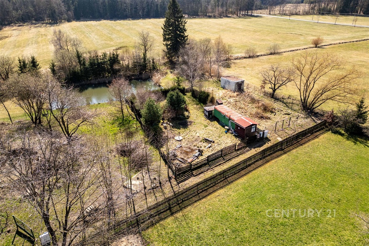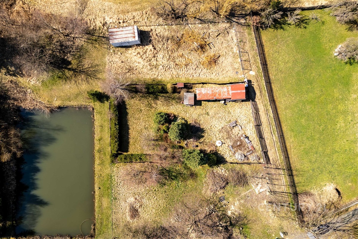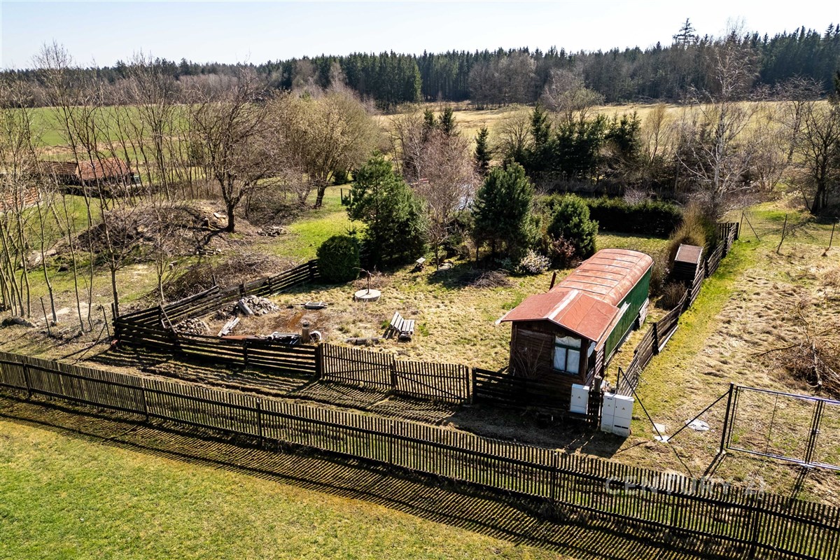 Na pozemku se navíc nachází maringotka, kolna a menší kotec, které mohou posloužit jako praktické zázemí během výstavby.