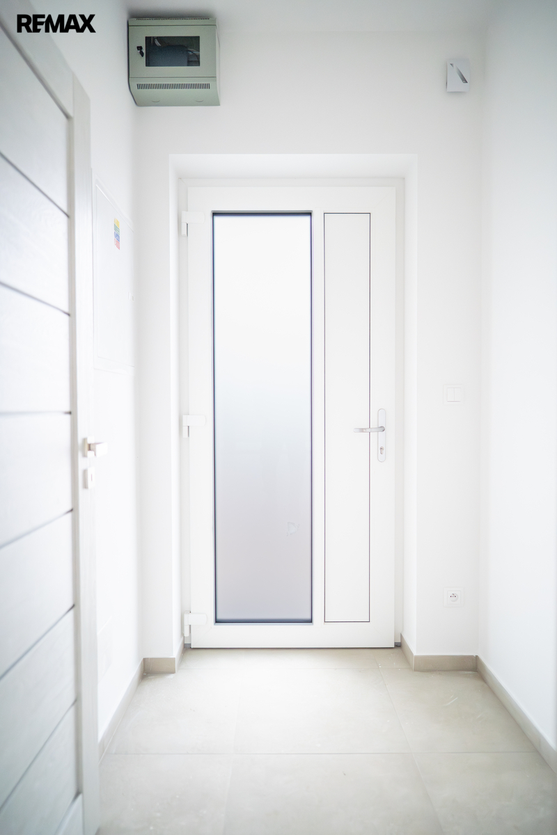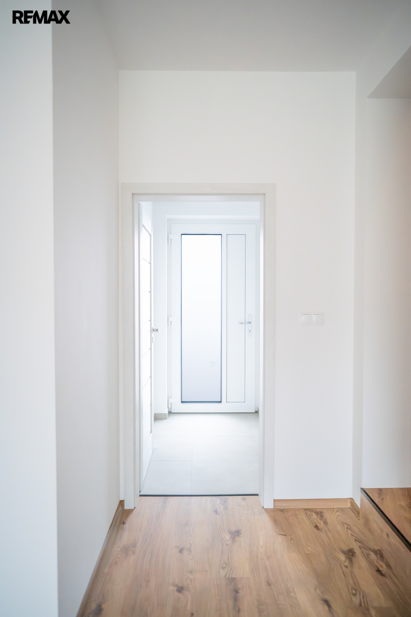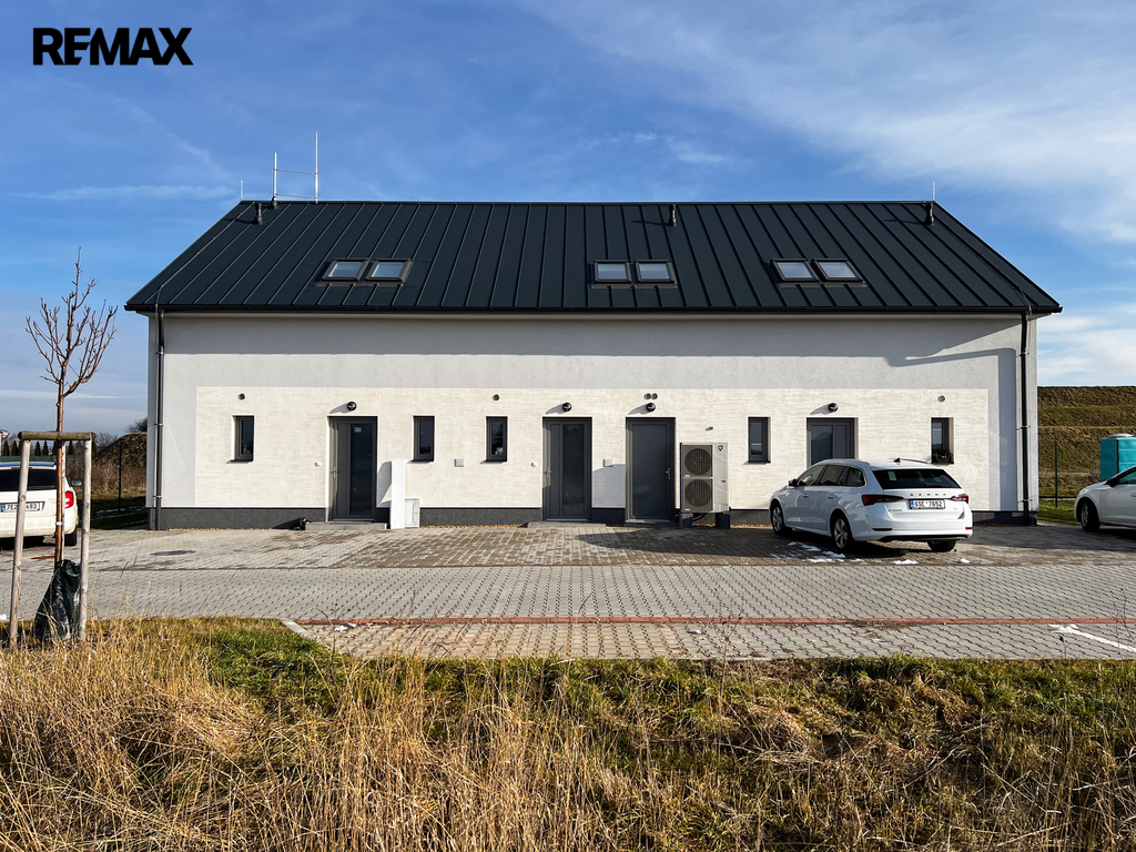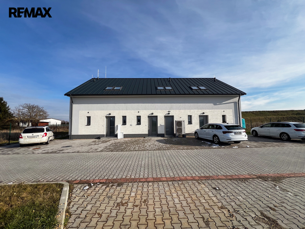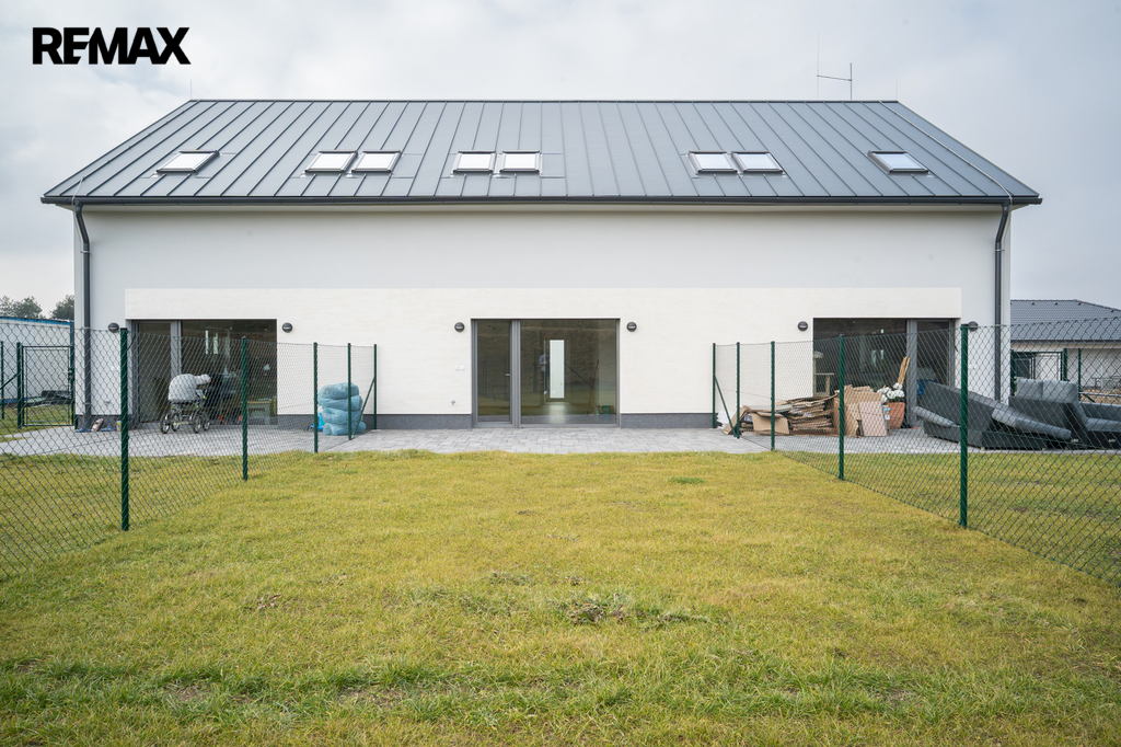 Novostavba o dispozici 3+kk nabízí téměř 100 m² užitné plochy a vlastní pozemek o velikosti přes 100 m². Dům je navržen s důrazem na funkčnost, komfort a současný moderní styl. V přízemí se nachází vstupní chodba s místem pro vestavěné skříně, samostatná toaleta a praktická komora pod schody, kterou lze využít jako spíž či úklidový prostor. Dominantou je světlý obývací pokoj s kuchyňským koutem a velkým francouzským oknem, které plynule propojuje interiér s terasou o velikosti přibližně 12 m² a navazující zahradou – ideálním místem pro letní posezení, grilování i rodinné chvíle.