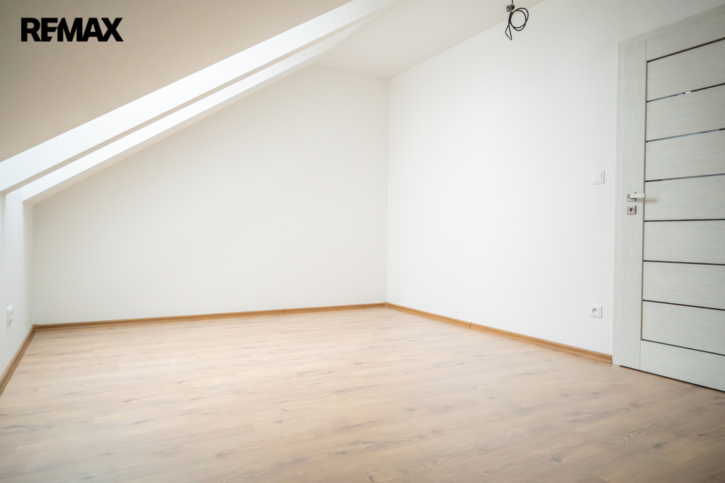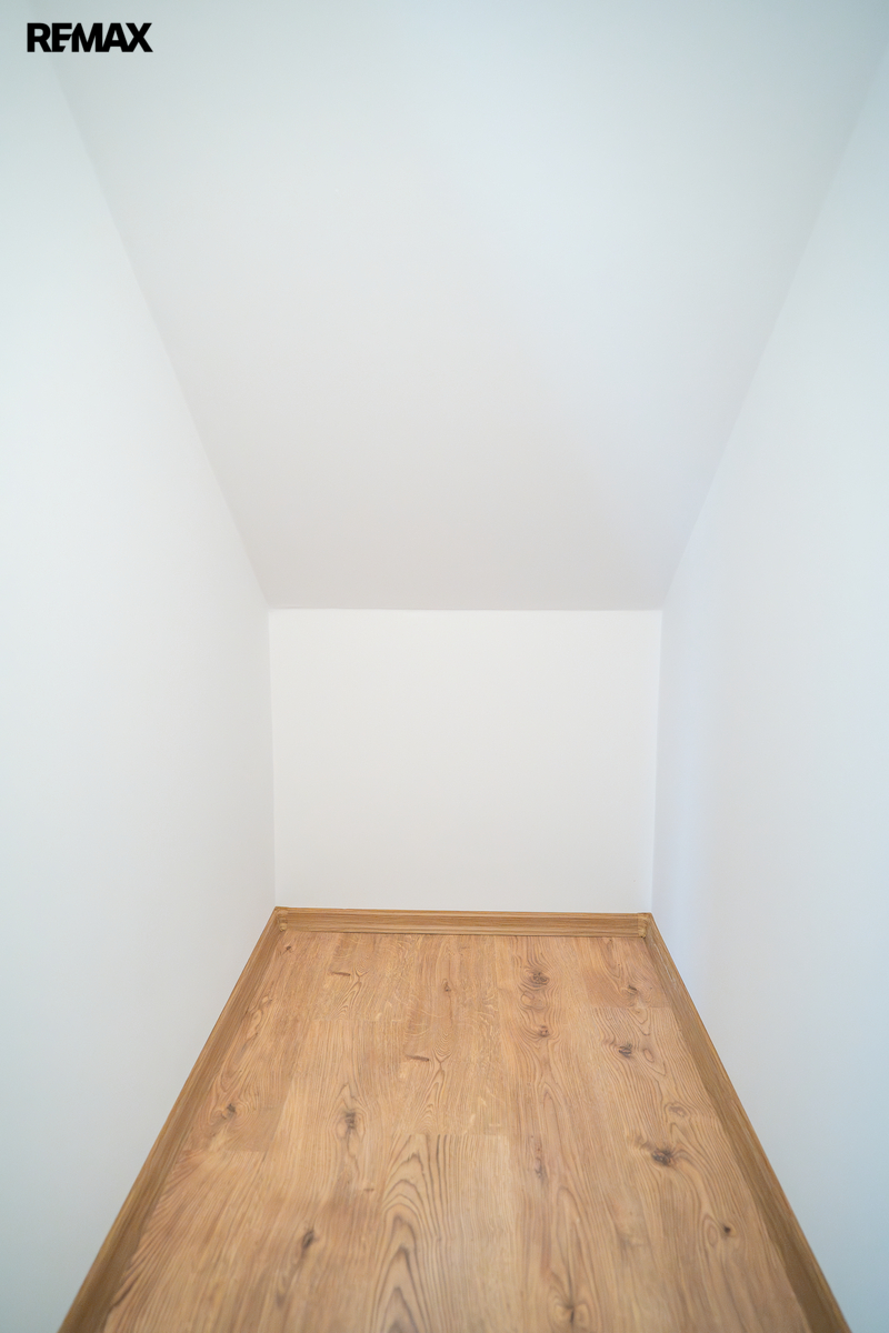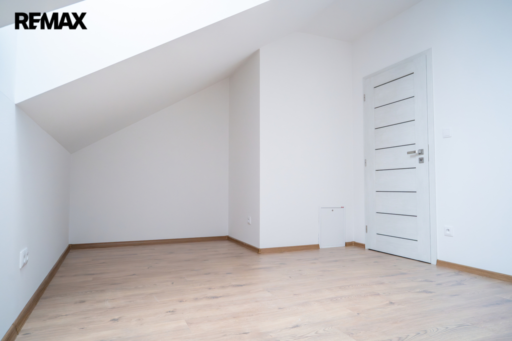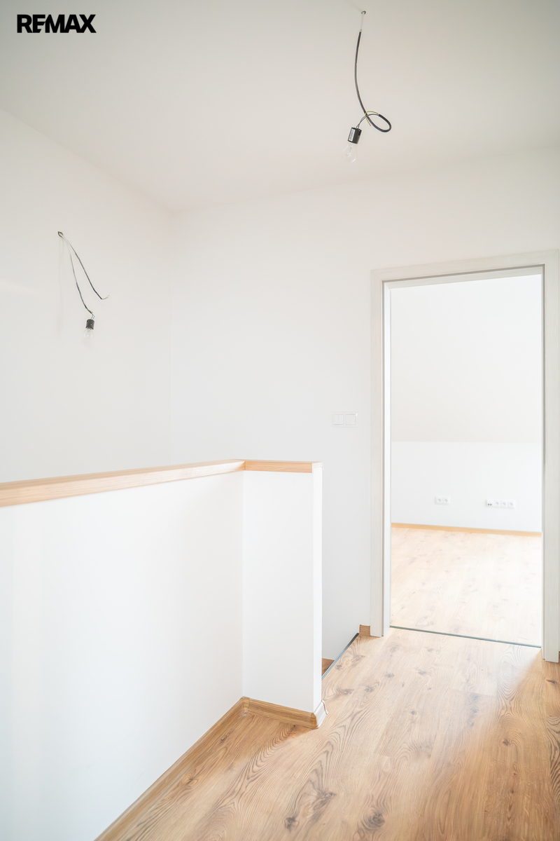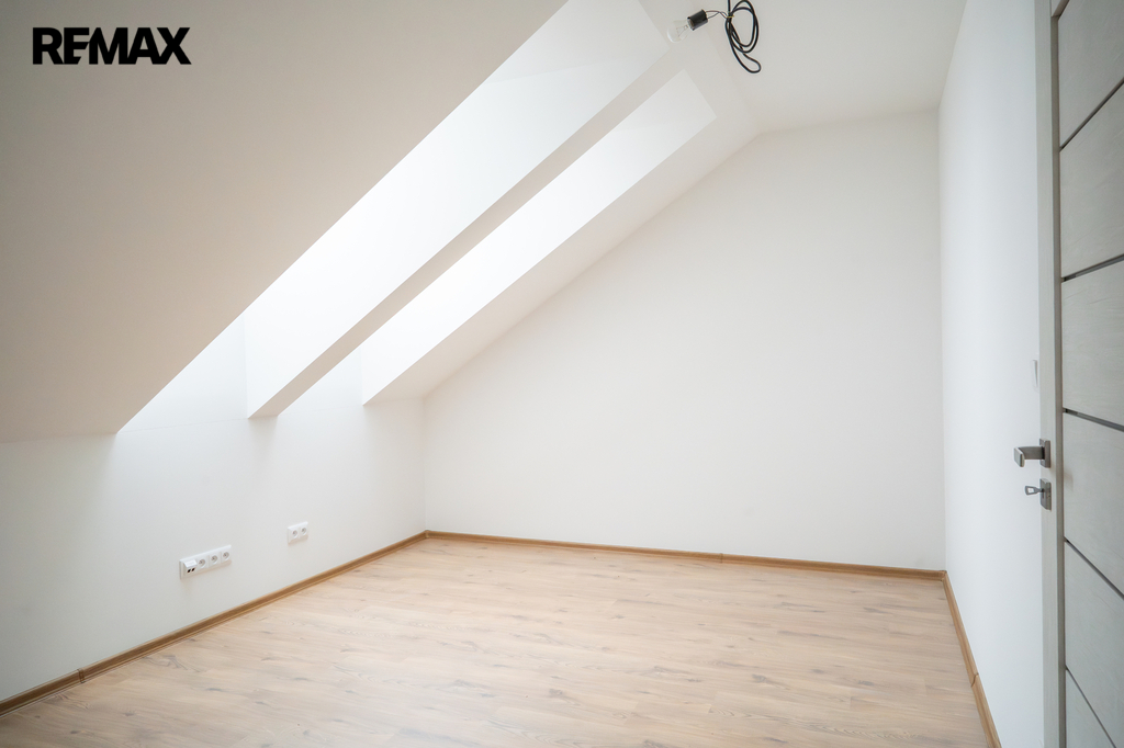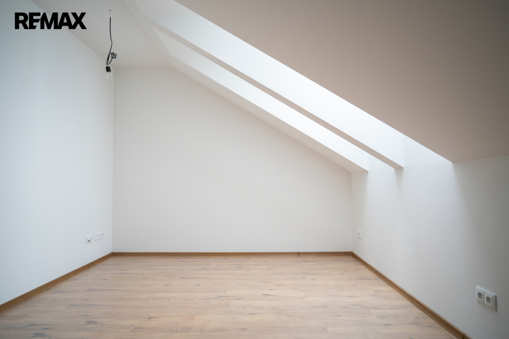 V patře se nachází dětský pokoj, prostorná ložnice a koupelna. Interiér je příjemně prosvětlen designovými střešními okny, která dodávají místnostem vzdušnost a přirozené světlo. K domu náleží dvě parkovací místa přímo před vstupem.