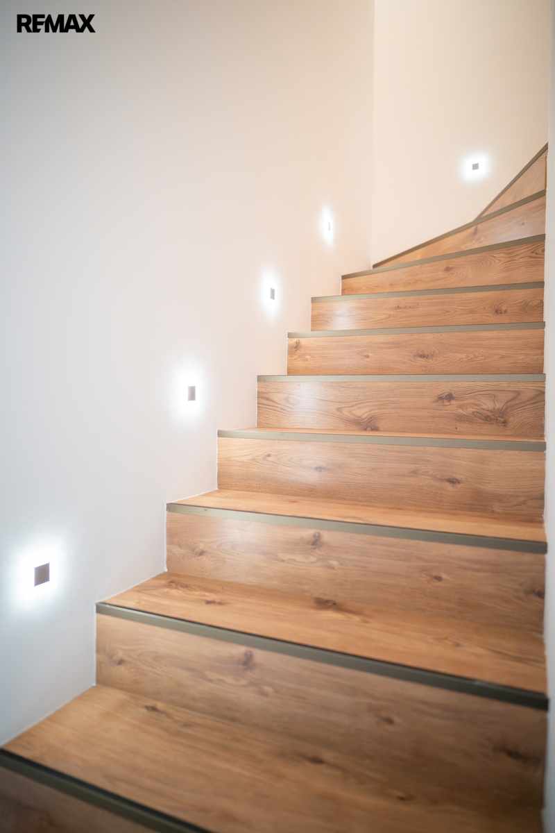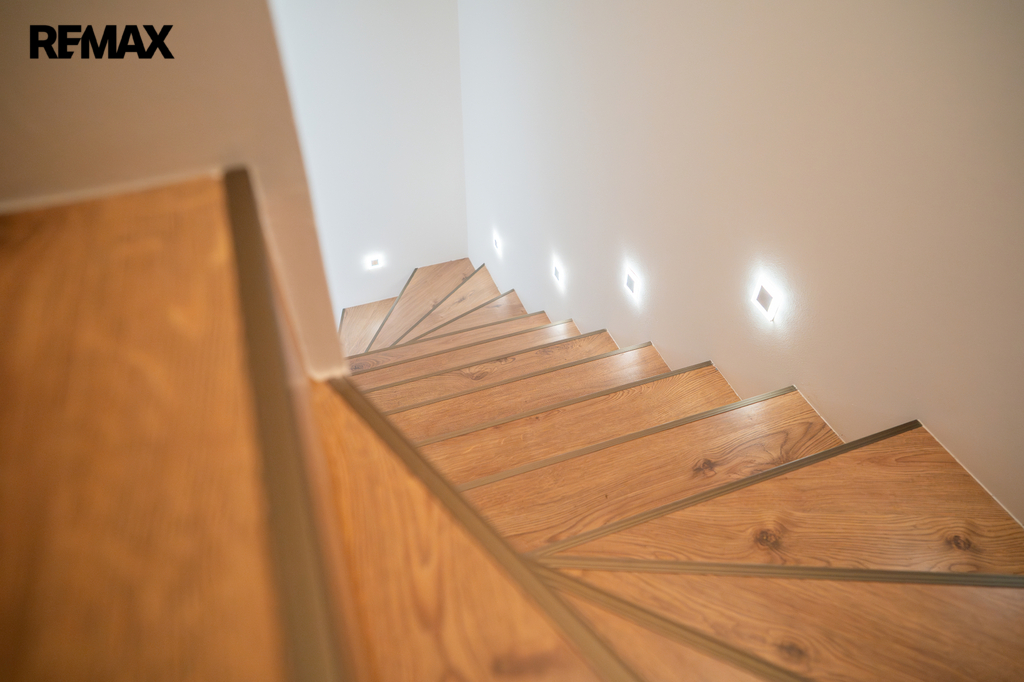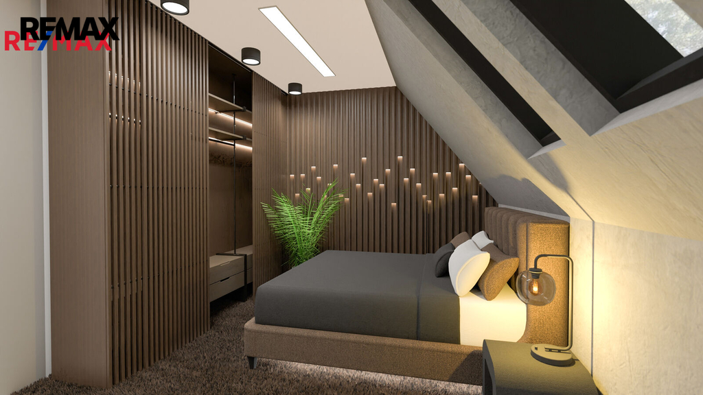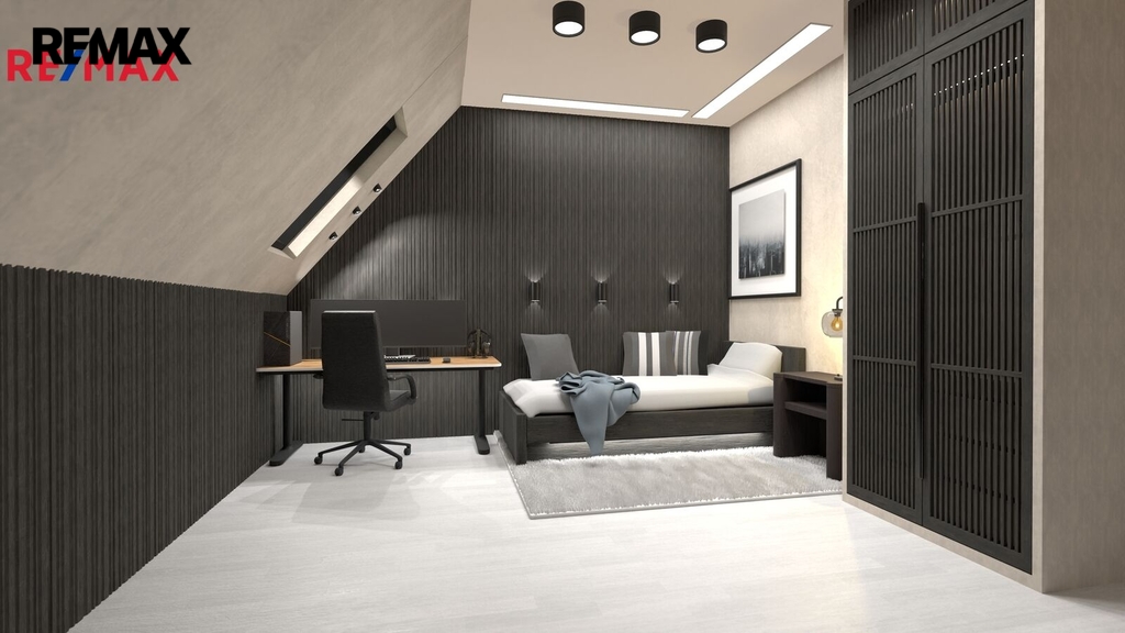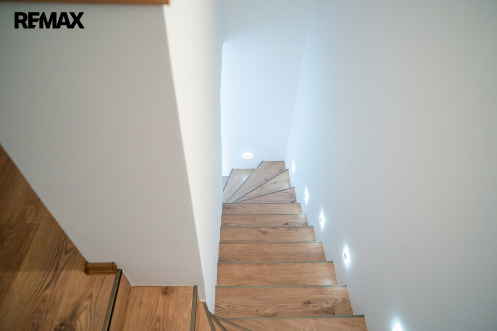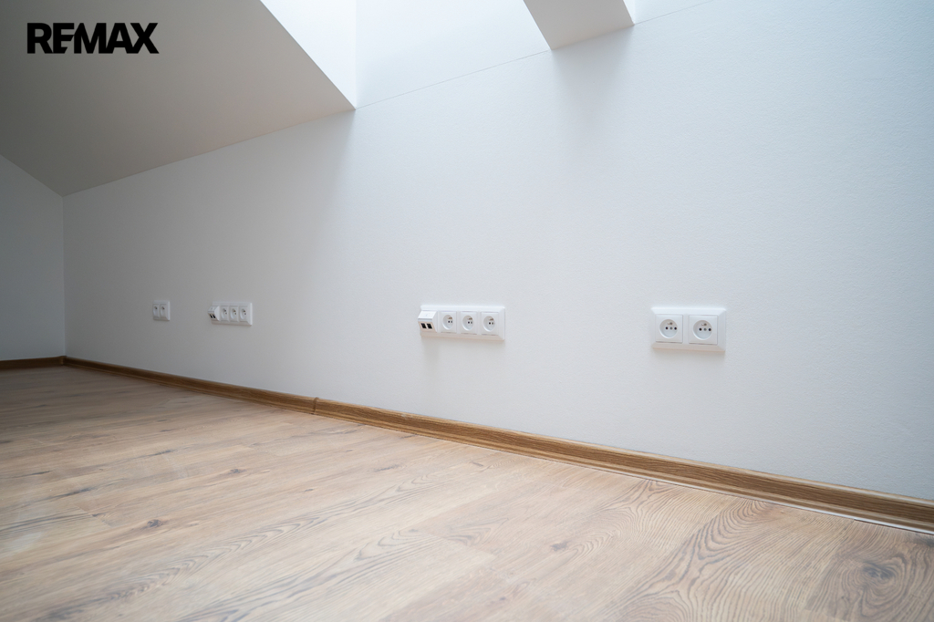 V patře se nachází dětský pokoj, prostorná ložnice a koupelna. Interiér je příjemně prosvětlen designovými střešními okny, která dodávají místnostem vzdušnost a přirozené světlo. K domu náleží dvě parkovací místa přímo před vstupem.