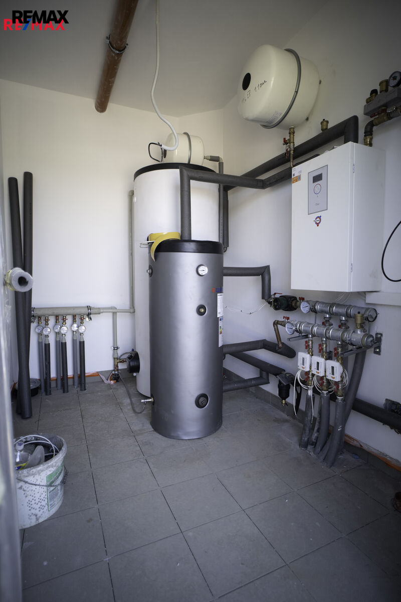 Technické řešení odpovídá současným nárokům na úsporné bydlení – dům je vybaven tepelným čerpadlem a kvalitní izolací, což zajišťuje nízké provozní náklady a příjemné klima po celý rok. Samozřejmostí je příprava na venkovní žaluzie i možnost instalace fotovoltaiky.