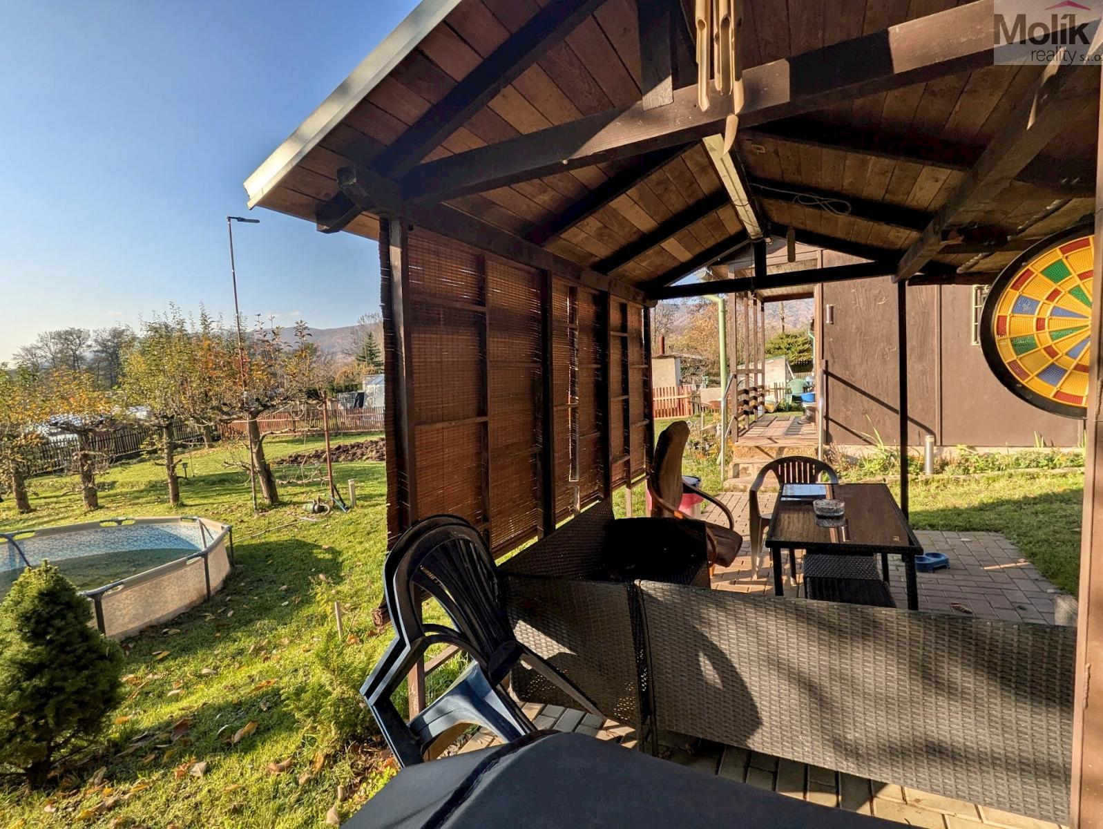 Chata stojí místě s hezkým výhledem a přímo za ní se rozprostírá les, do kterého je vstup ze zadní části zahrady. Díky menší kolonii zde najdete klid, soukromí i nezaměnitelnou atmosféru. Zahrada je udržovaná, lehce svažitá a na pozemku se nachází bazén, jabloně a pergola s posezením - ideální místo pro večery s rodinou či přáteli. (Nábytek v pergole i téměř nový plynový gril jsou součástí kupní ceny.) Příjezdová cesta je částečně zpevněná, vysypaná kamínky.