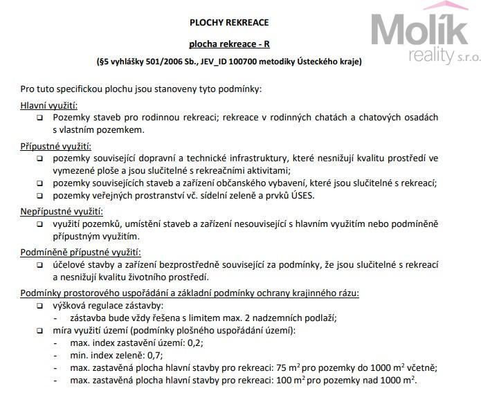 Dle platného územního plánu se parcela nachází v ploše rekreace - R. Podle územního plánu je v této oblasti povolena výstavba rekreačních objektů do dvou nadzemních podlaží. Na pozemku o této velikosti je možné postavit stavbu pro rekreaci s maximální zastavěnou plochou 75 m. Tato regulace tedy umožňuje výstavbu nové větší stavby v souladu s územním plánem. Zahrada by se tedy dala využít také k trvalému bydlení, vodu by bylo možné vyřešit vrtem a odpady například čističkou odpadních vod.