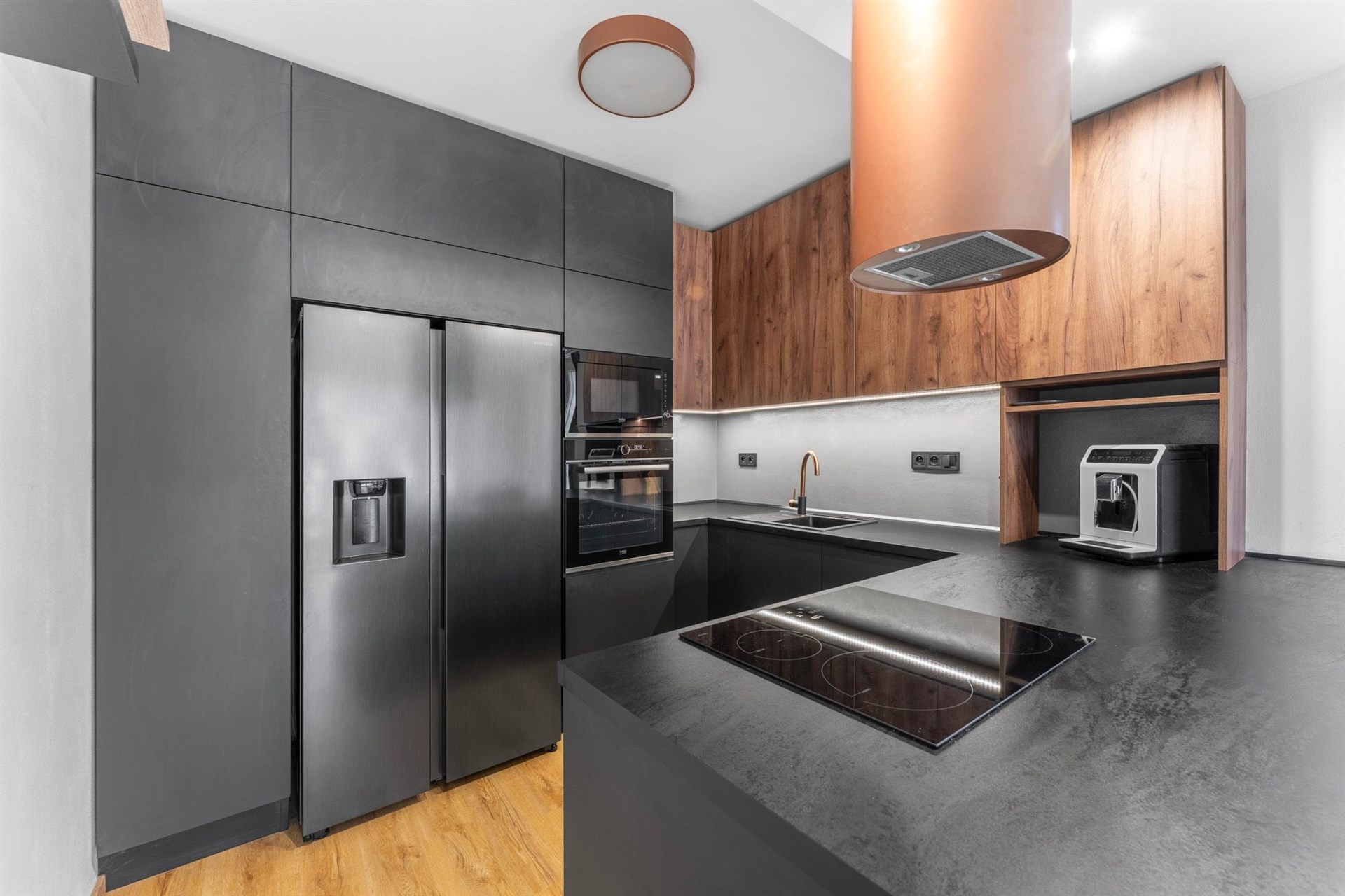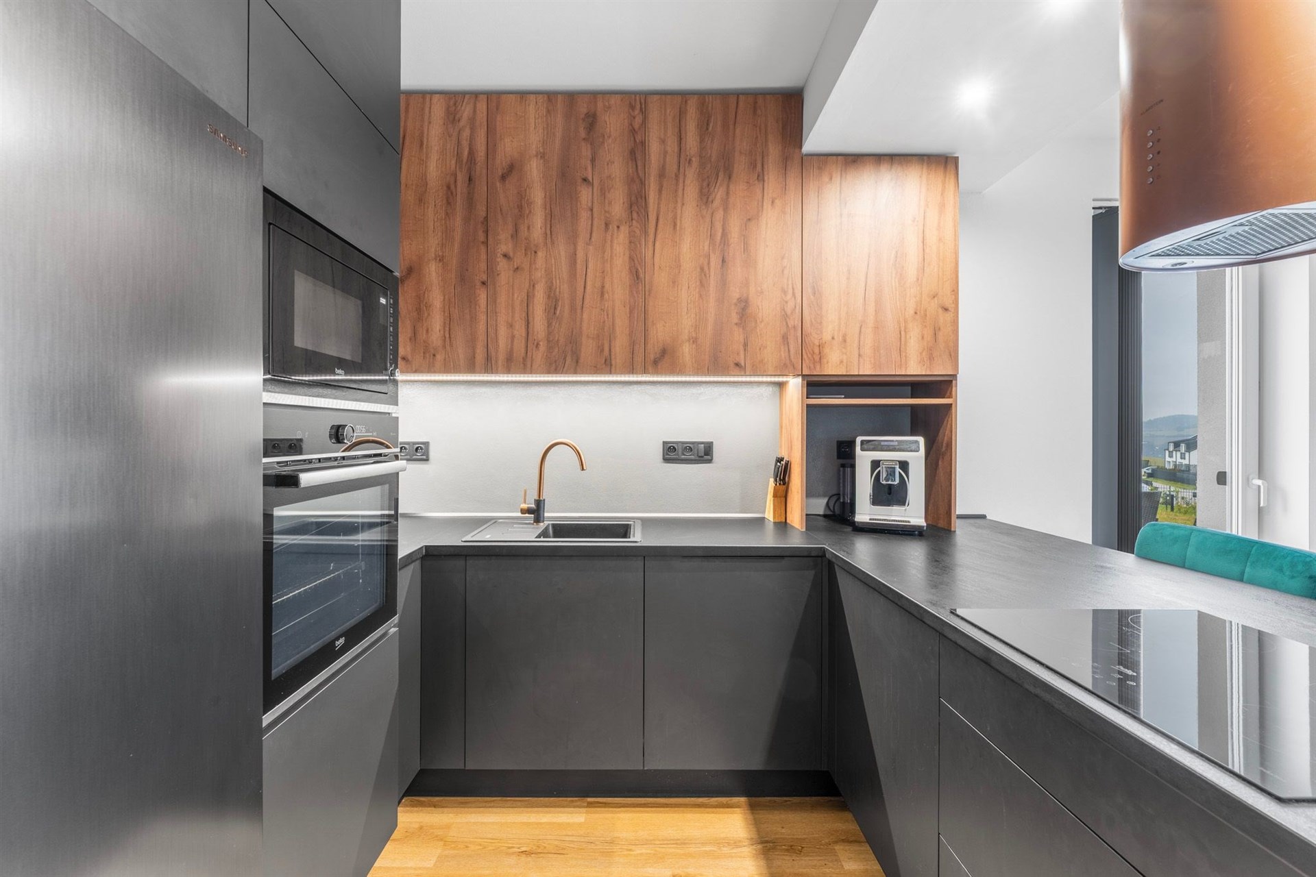 Kuchyň: Indukční varná deska, elektrická trouba, vestavěná lednice, vestavěný mrazák, mikrovlnná trouba, komínová digestoř, myčka nádobí.