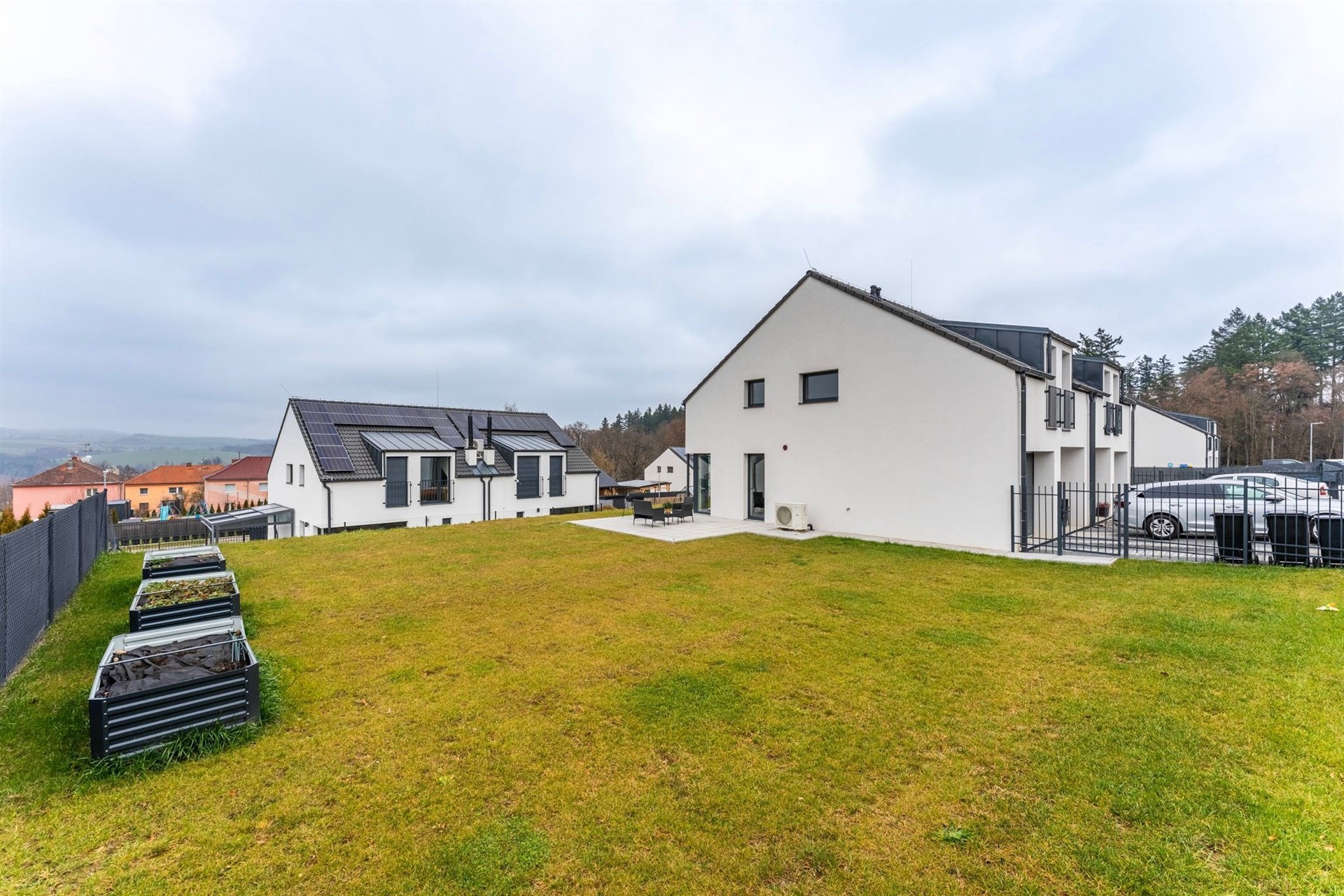 Zahrada: Připravená na pěstování ve vyvýšených záhonech, jinak travnatá plocha s minimální údržbou. Místo na grilování na terase.