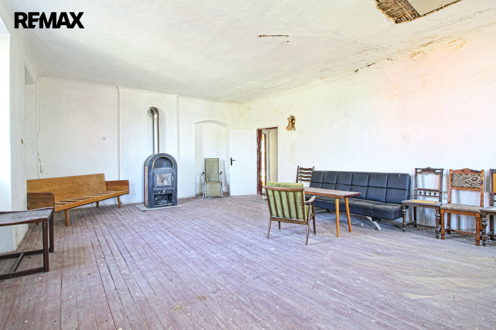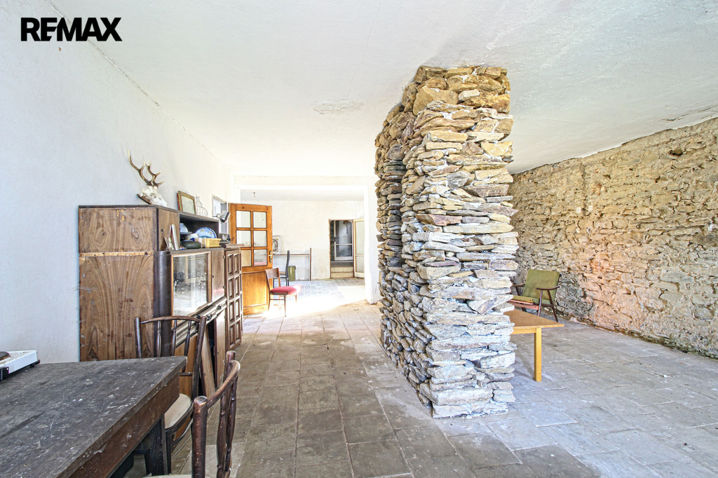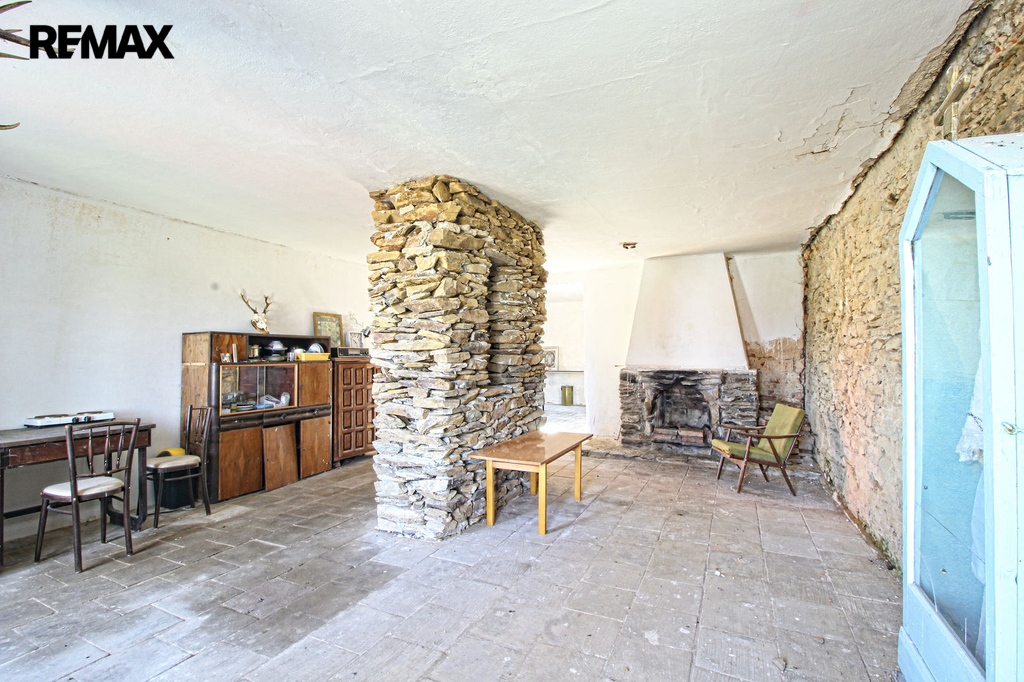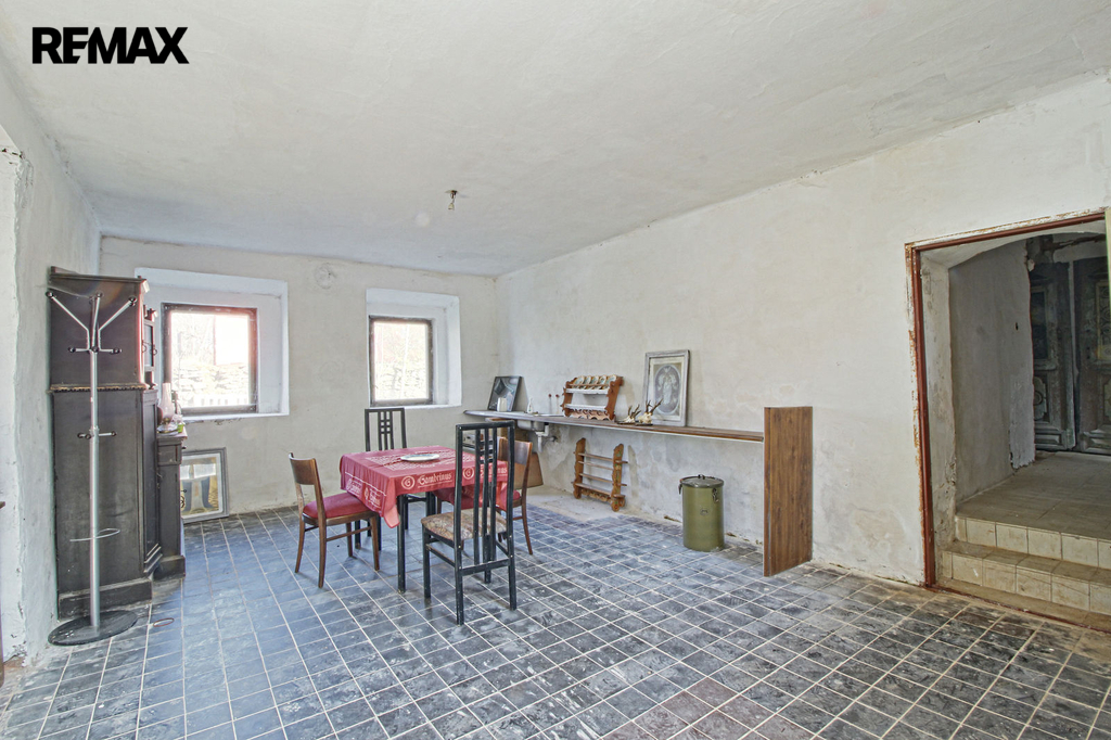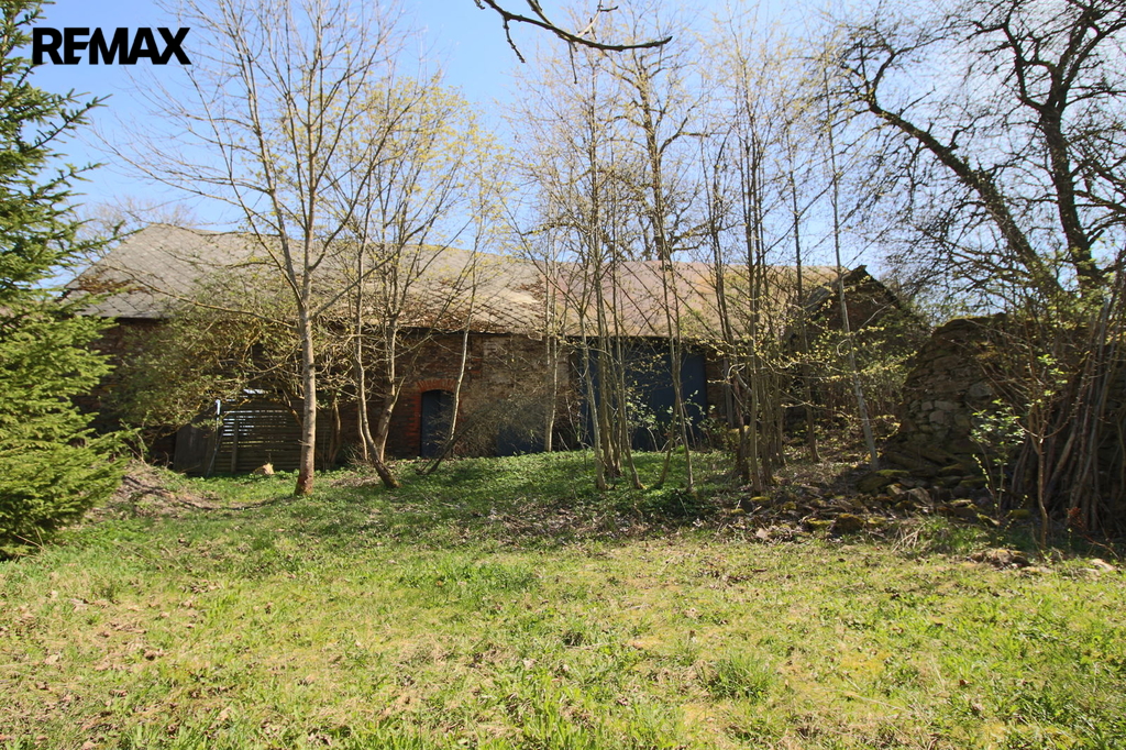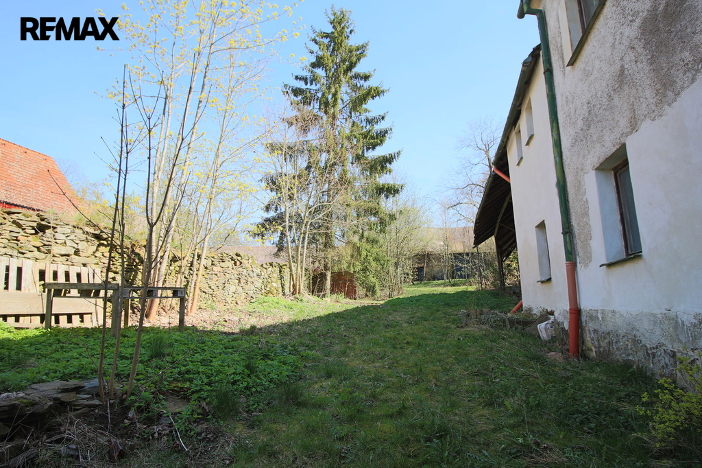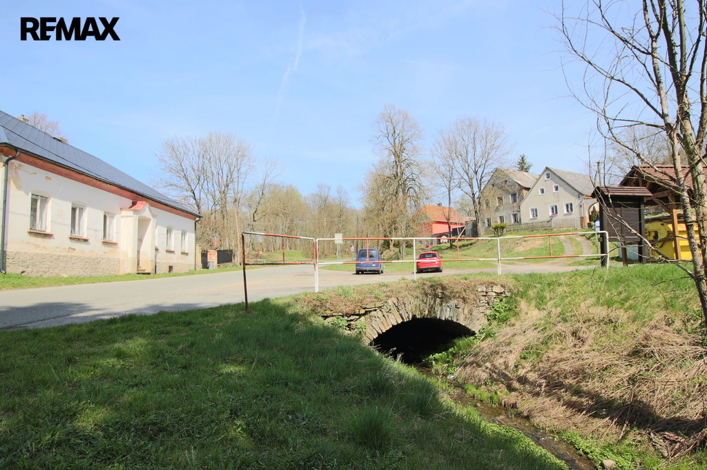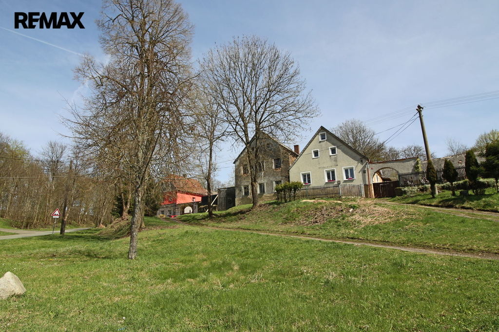 V přízemí o podlahové ploše cca 117 m2 se nachází dvě společenské místnosti, zázemí pro obsluhu objektu, koupelna, WC, chodba se schodištěm do sklepních prostor, ale i schodiště do prvního patra, které disponuje v rozloze cca 130 m2 čtyřmi ložnicemi, chodbou se schodištěm a místností se schodištěm na půdu, která opět nabízí možnost budoucího využití. Nemovitost má mnoho prvků poctivé architektury původních obyvatel Sudet. Na pozemcích o celkové ploše 2003 m2 se kromě objektu k bydlení nachází torzo původní stavby stájí a chlévů a hlavně prostorná stodola s krovem ve slušném stavu. Za stodolou najdeme zahradu o výměře 593 m2. Do objektu je přivedena elektřina i obecní vodovod. Kanalizaci řeší zabudovaný septik vedle domu. Aktuální stav celé nemovitosti dokládá přiložená fotodokumentace.