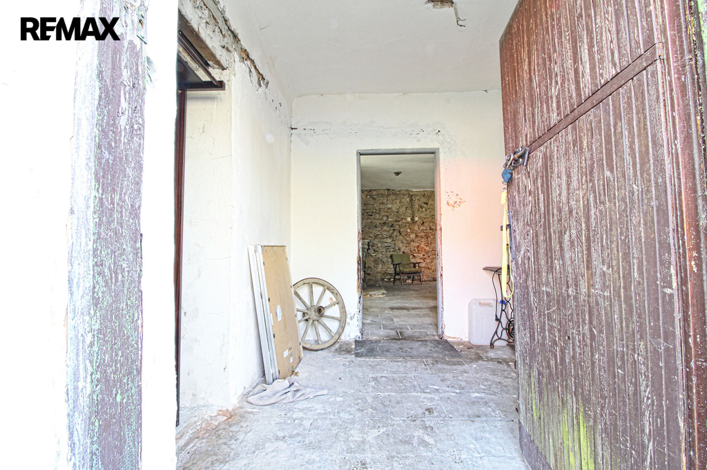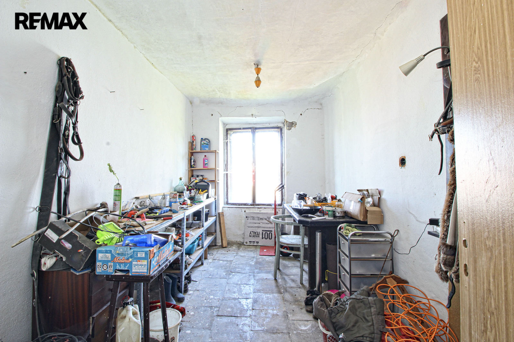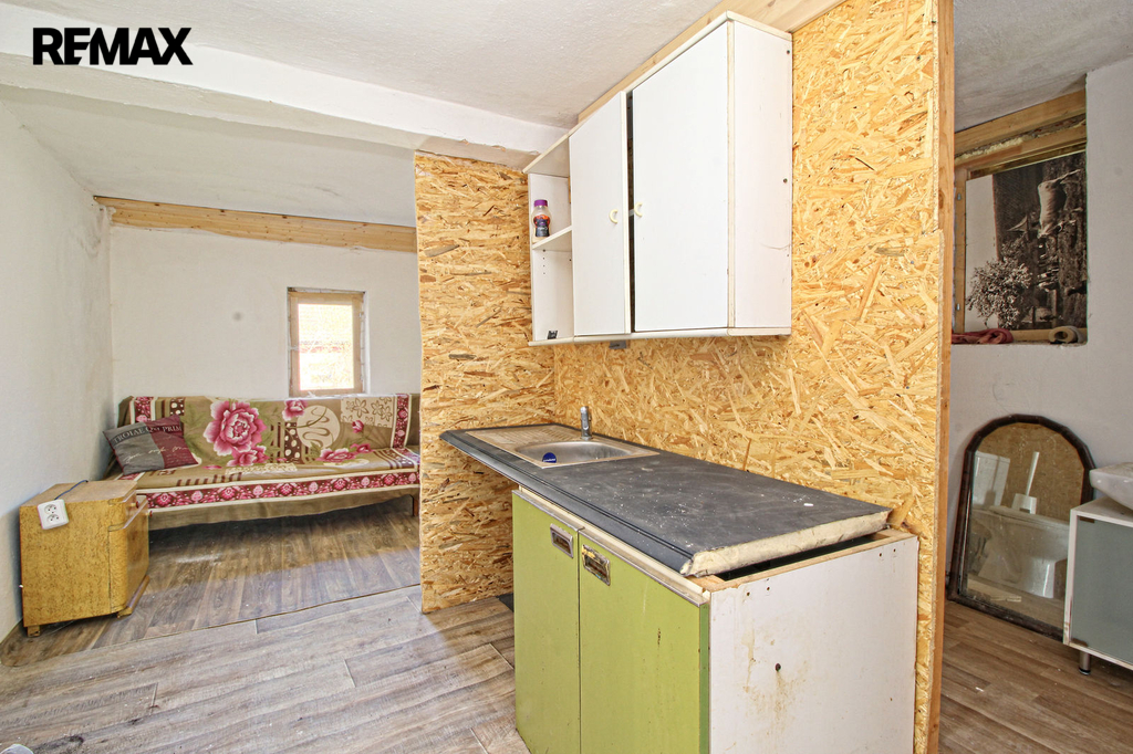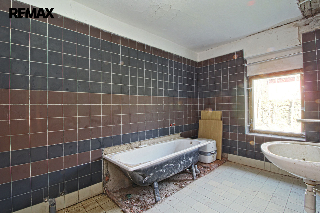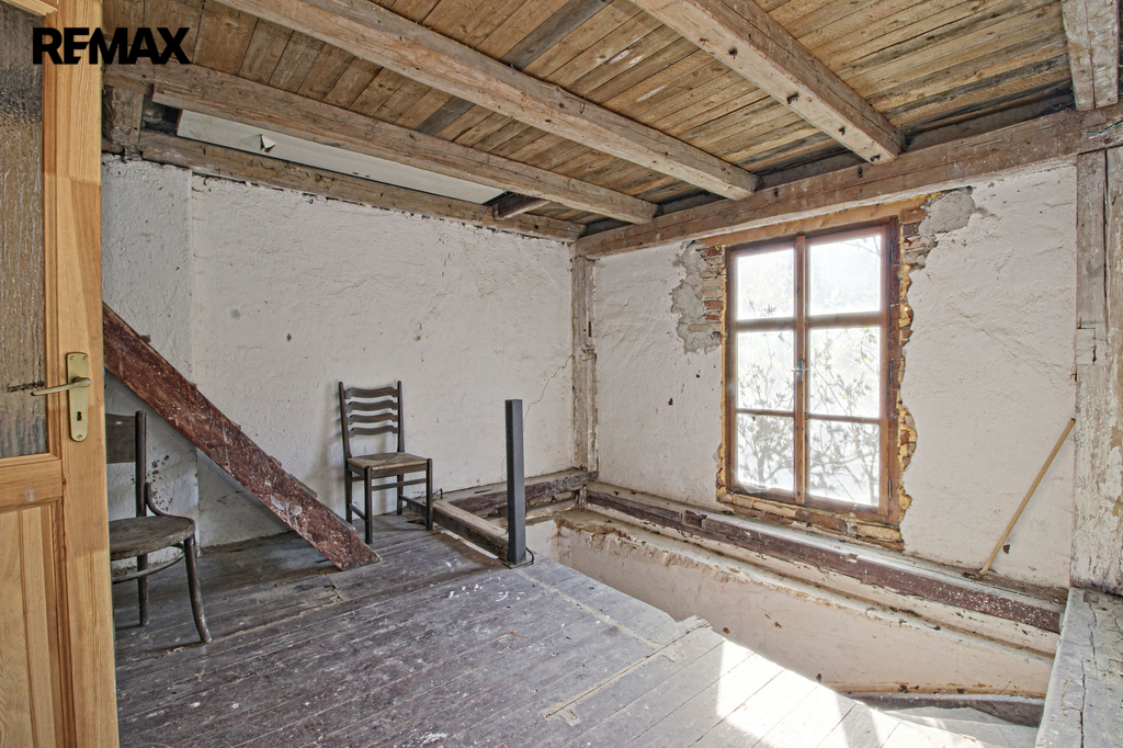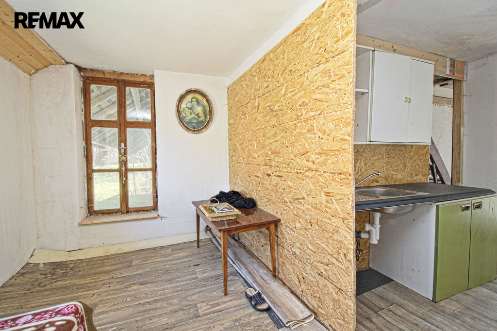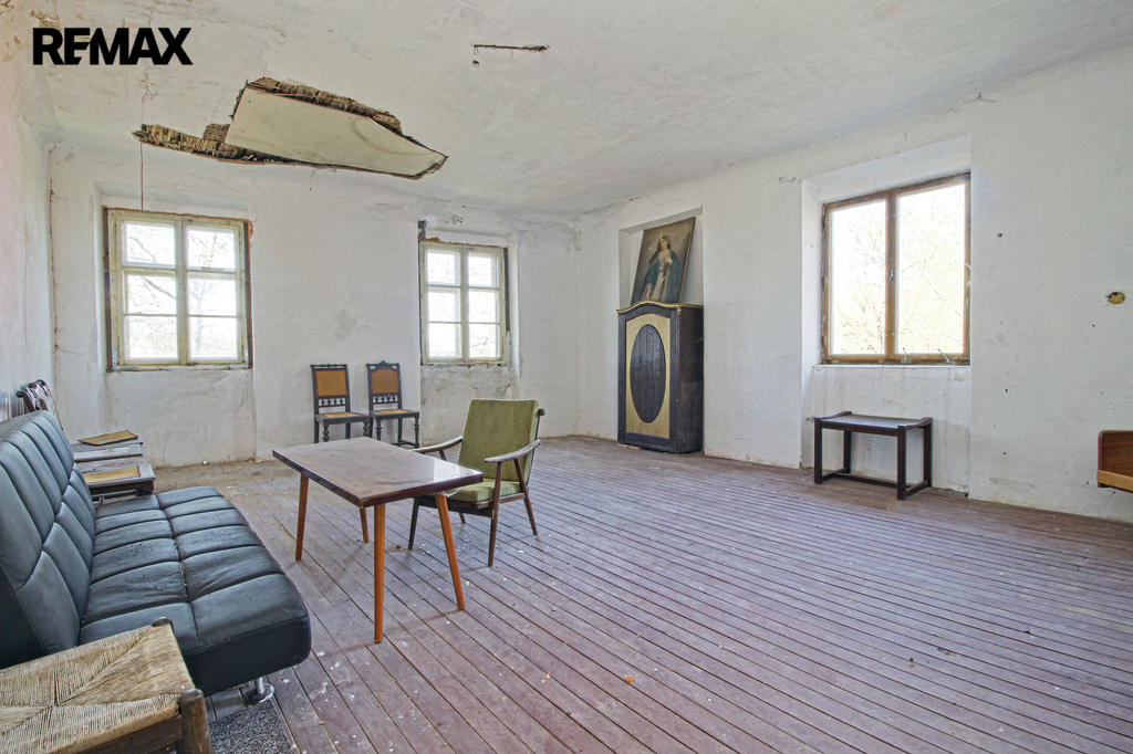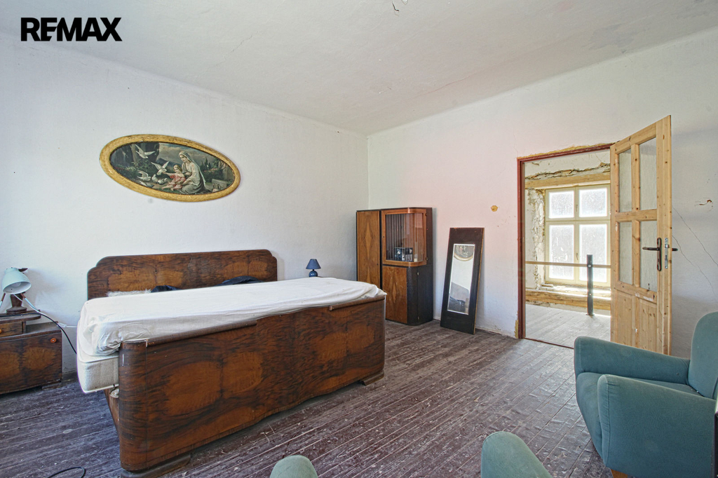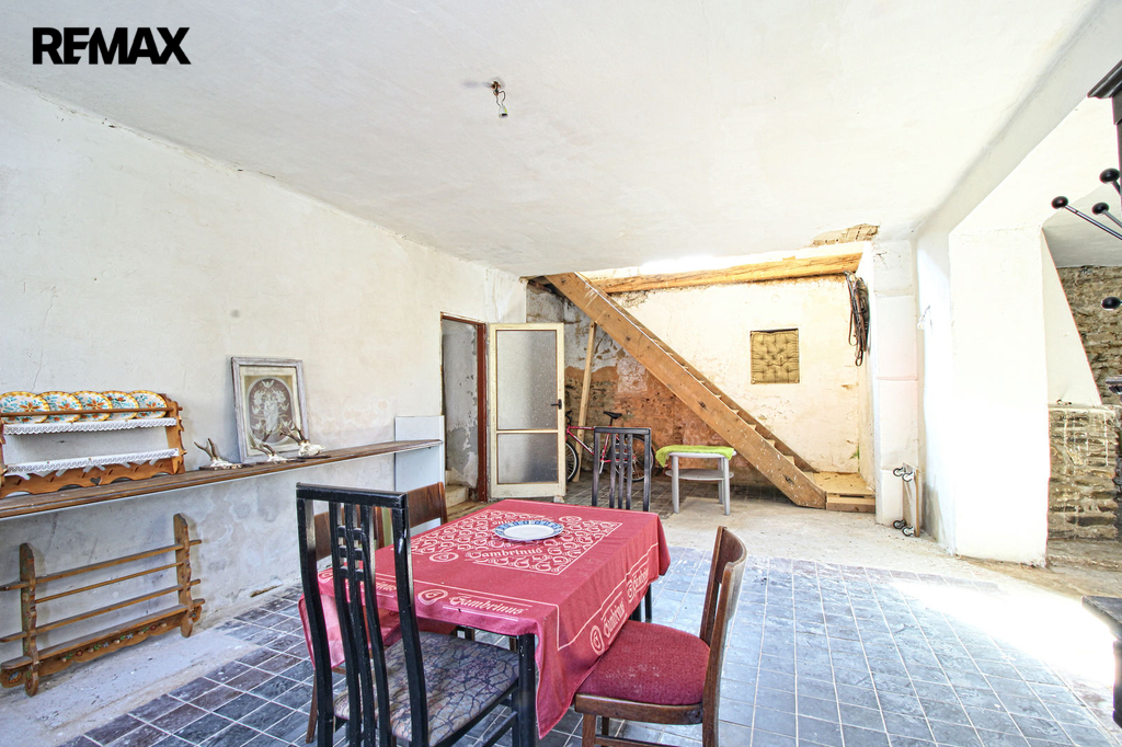 V přízemí o podlahové ploše cca 117 m2 se nachází dvě společenské místnosti, zázemí pro obsluhu objektu, koupelna, WC, chodba se schodištěm do sklepních prostor, ale i schodiště do prvního patra, které disponuje v rozloze cca 130 m2 čtyřmi ložnicemi, chodbou se schodištěm a místností se schodištěm na půdu, která opět nabízí možnost budoucího využití. Nemovitost má mnoho prvků poctivé architektury původních obyvatel Sudet. Na pozemcích o celkové ploše 2003 m2 se kromě objektu k bydlení nachází torzo původní stavby stájí a chlévů a hlavně prostorná stodola s krovem ve slušném stavu. Za stodolou najdeme zahradu o výměře 593 m2. Do objektu je přivedena elektřina i obecní vodovod. Kanalizaci řeší zabudovaný septik vedle domu. Aktuální stav celé nemovitosti dokládá přiložená fotodokumentace.