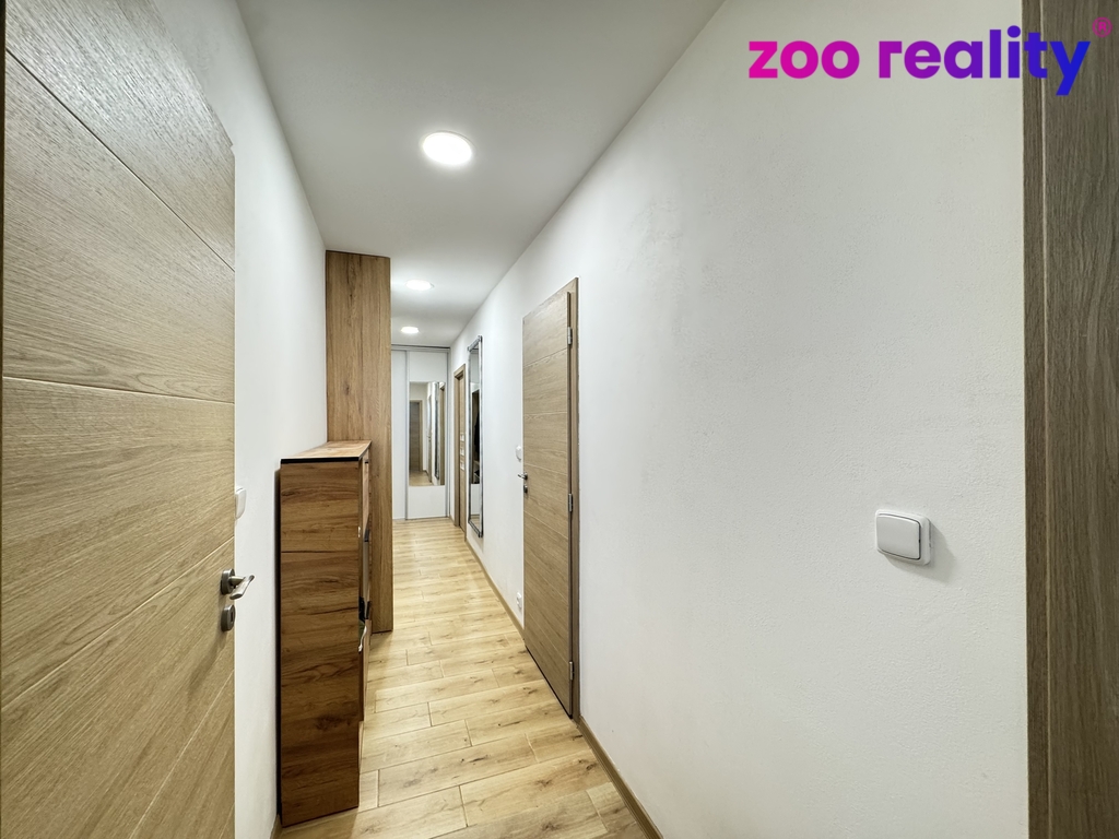 Najdeme zde vstupní předsíň, komoru, kuchyni s vestavěnými spotřebiči a vstupem na zasklenou lodžii, která navazuje na obývací pokoj a sousedí se samostatným pokojem. Z předsíně s vestavěnou skříní vedou dveře do koupelny spojené s toaletou, je zde vana se skleněnou sprchovou zástěnou a je zde prostor pro pračku. Dalšími dveřmi vejdeme do ložnice.