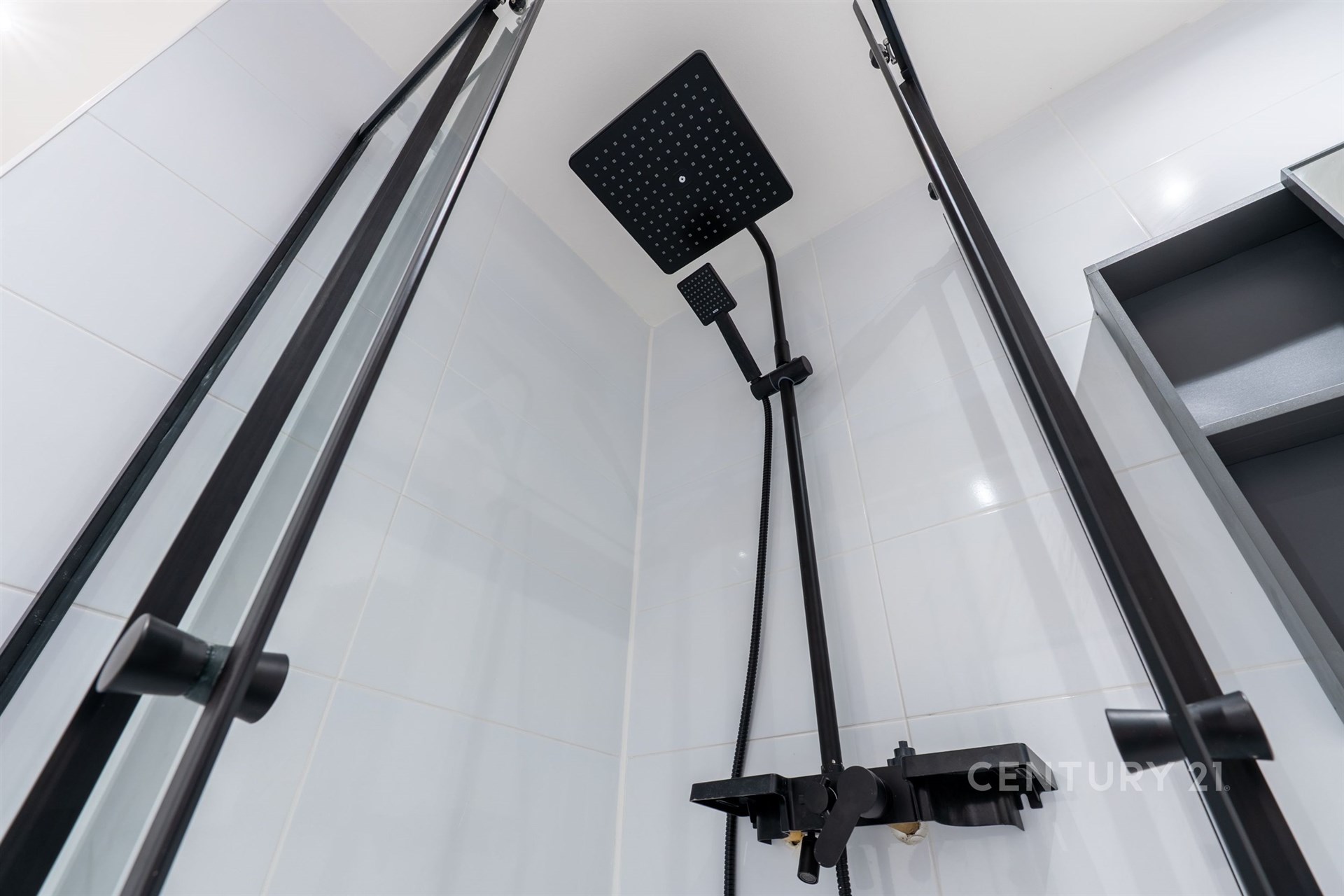 • Stylová koupelna se sprchovým koutem, černými doplňky, skříňkou pod umyvadlo a WC (dveře do koupelny jsou zásuvné)