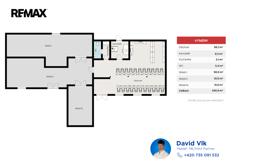 Dispozice je navržena velmi prakticky. Celek je díky tomu vhodný pro prodej, servis, skladování, showroom, dílnu, kancelářské zázemí i kombinaci více činností v rámci jednoho místa.