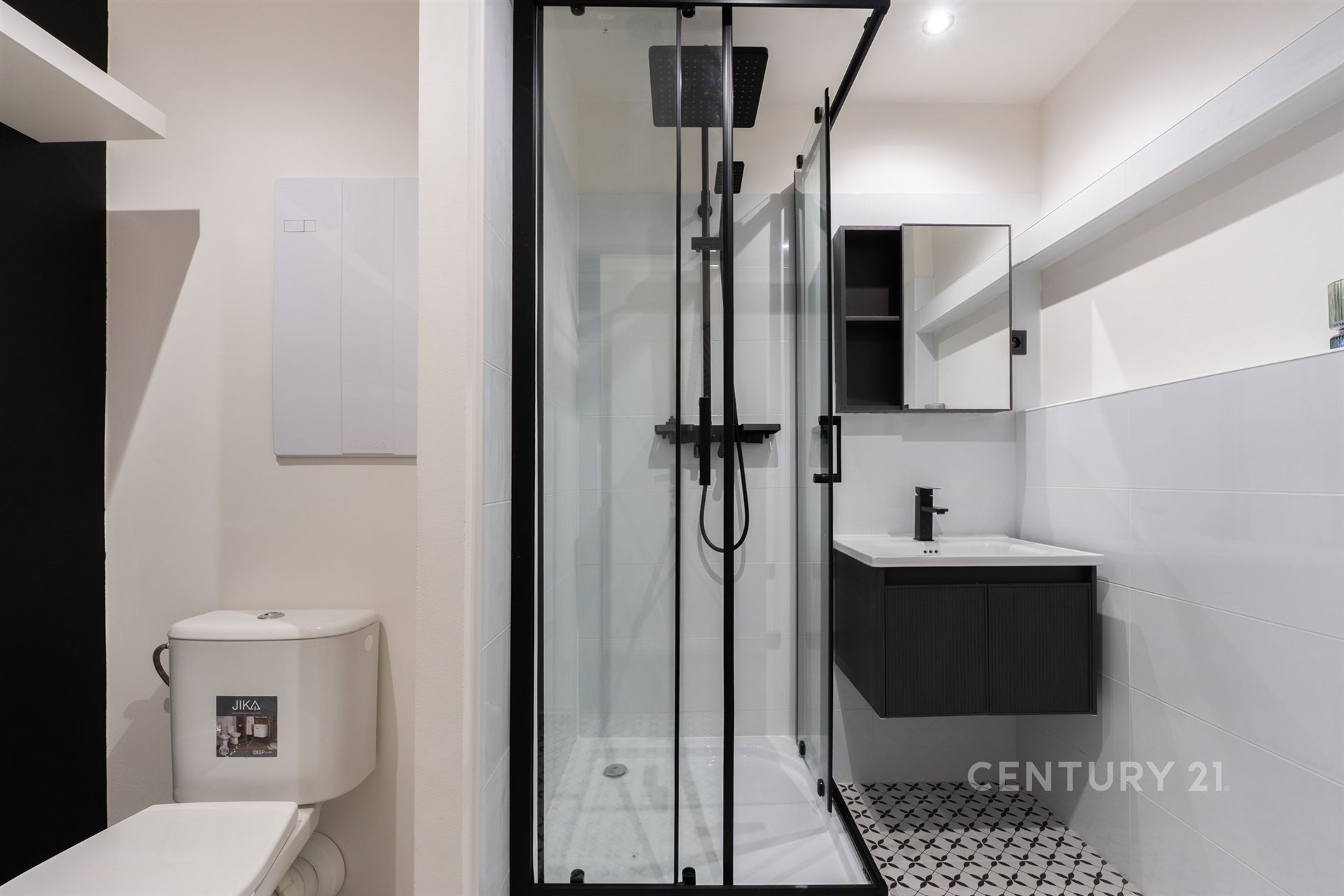 Vkusně řešenou koupelnu se sprchovým koutem, designovými černými doplňky a zásuvnými dveřmi