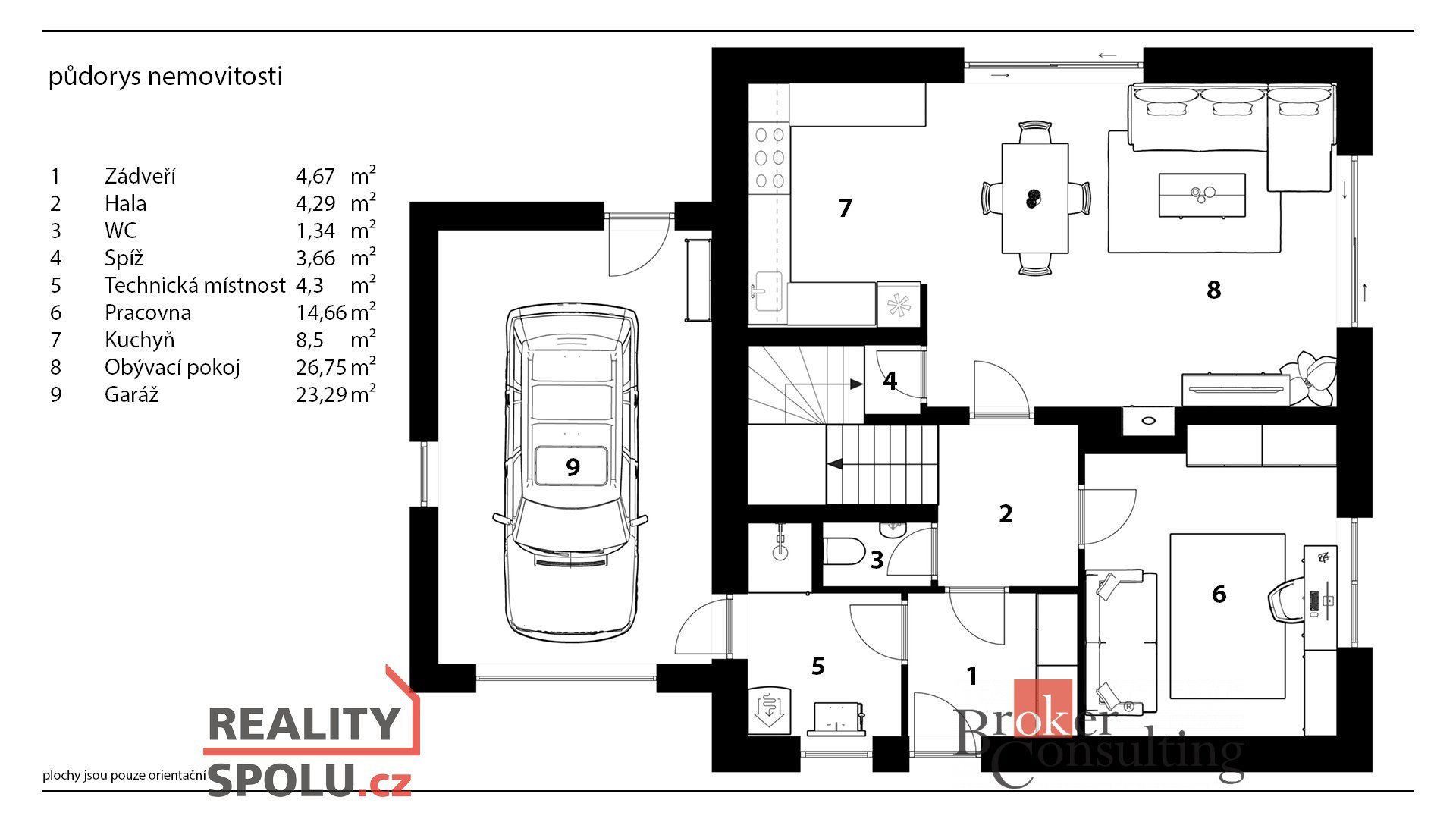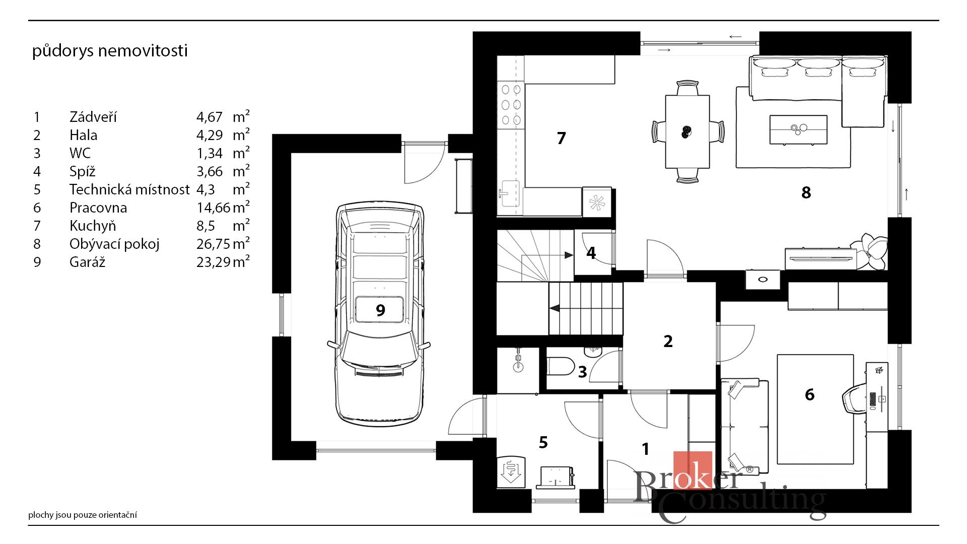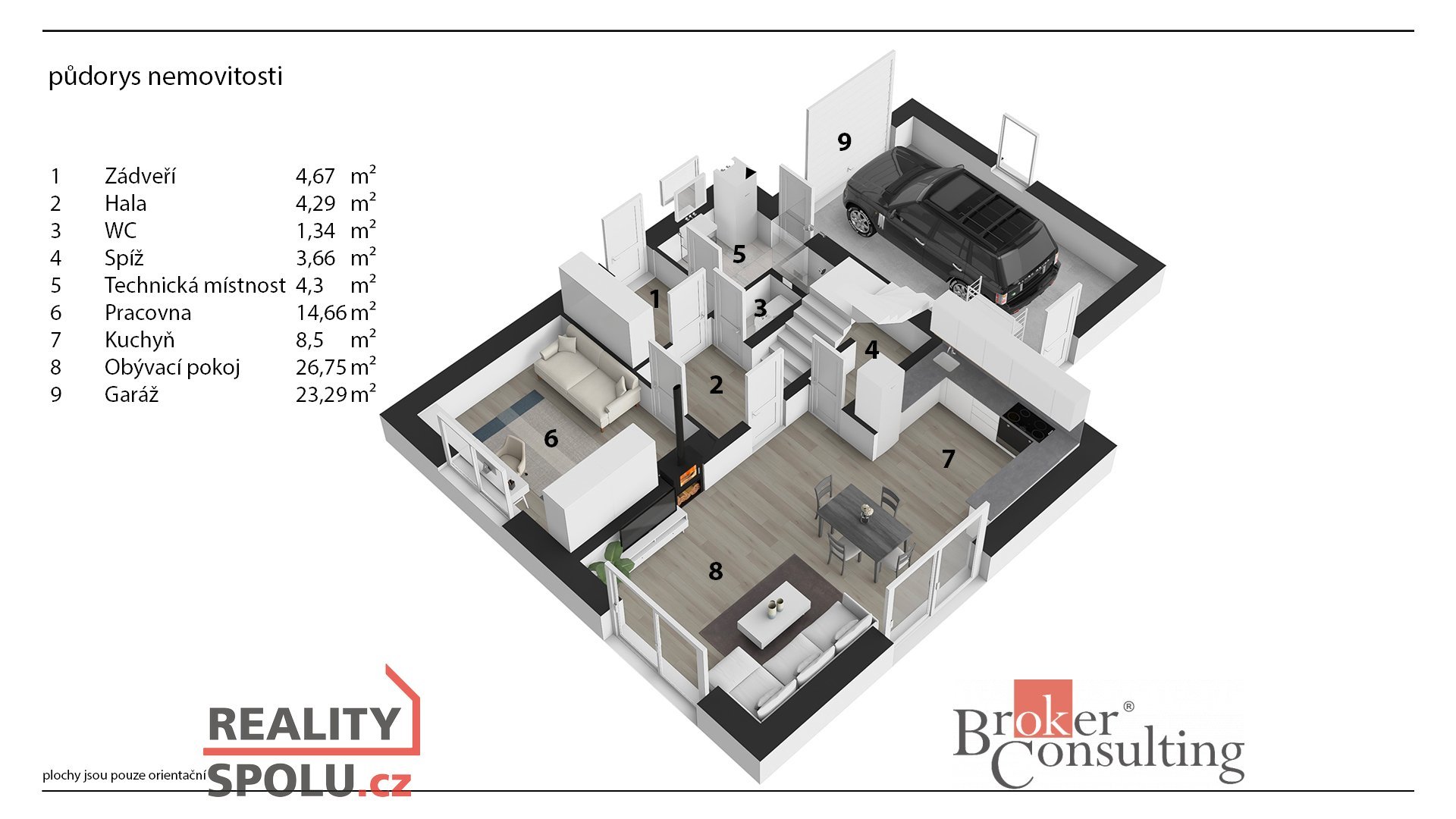 Uvedené výměry jsou orientační. Veškeré zveřejněné údaje obsažené v tomto inzerátu mají pouze informativní charakter a nejsou nabídkou ve smyslu § 1731 nebo § 1732 občanského zákoníku, ani se nejedná o veřejný příslib dle § 1733 občanského zákoníku.