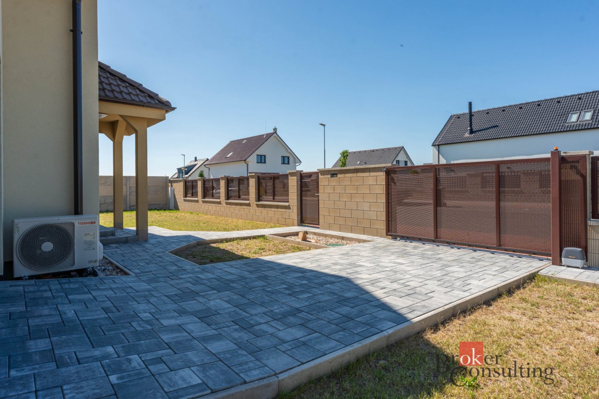 Oplocen ze všech stran. Na zahradě je umístěna nádrž o objemu 4 m³ na dešťovou vodu a vnější jednotka tepelného čerpadla - TOSHIBA. Terasu je možno situovat na jižní i západní stranu.